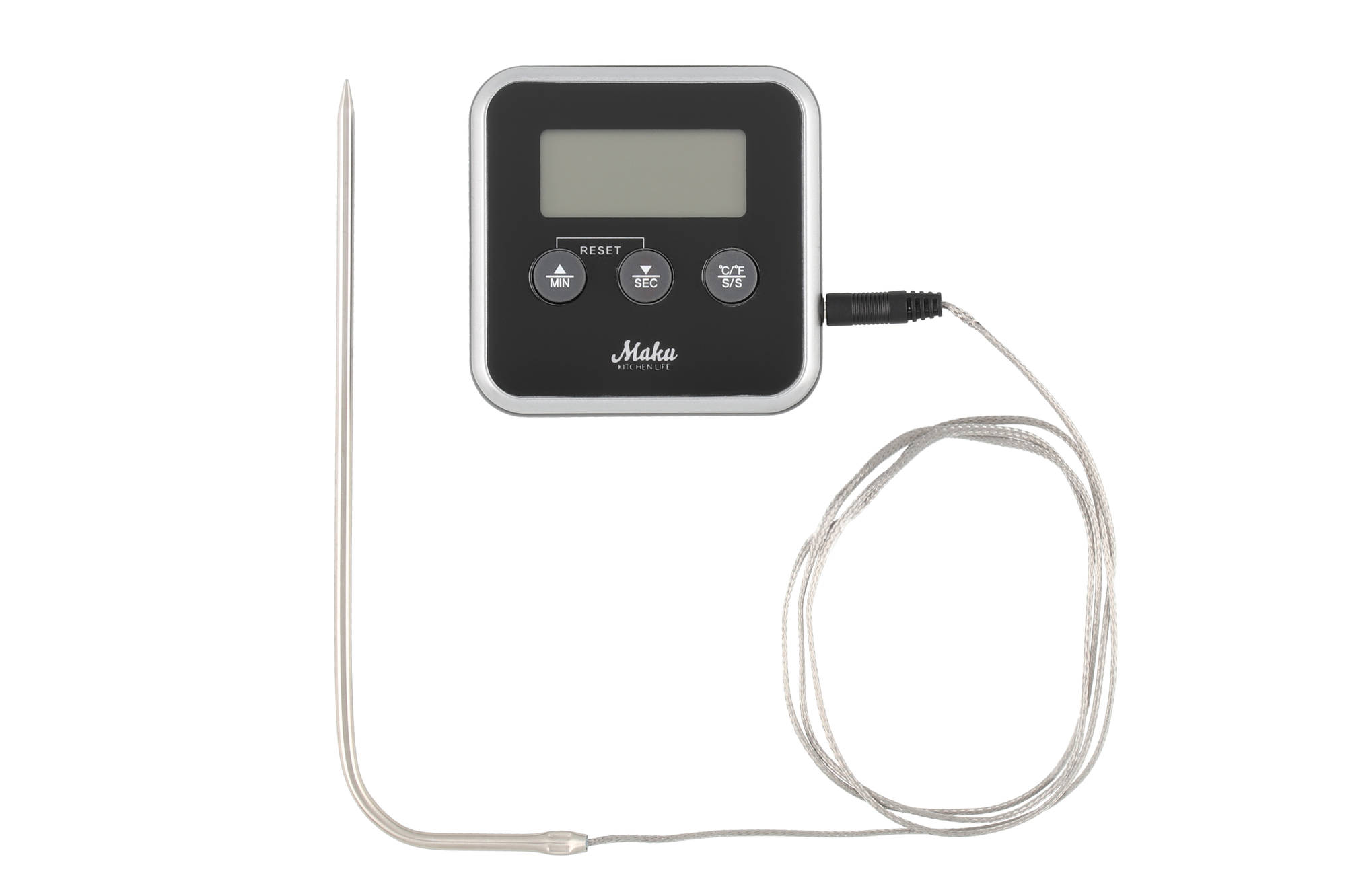 Digitaalisella paistolämpömittarilla on helppo valvoa ruoan lämpötilaa uunissa. Helppokäyttöinen. Mittausalue: 0-250 astetta. Laskurin aika: 00:01 - 23:59. 1 x AAA paristo, sisältyy pakkaukseen.