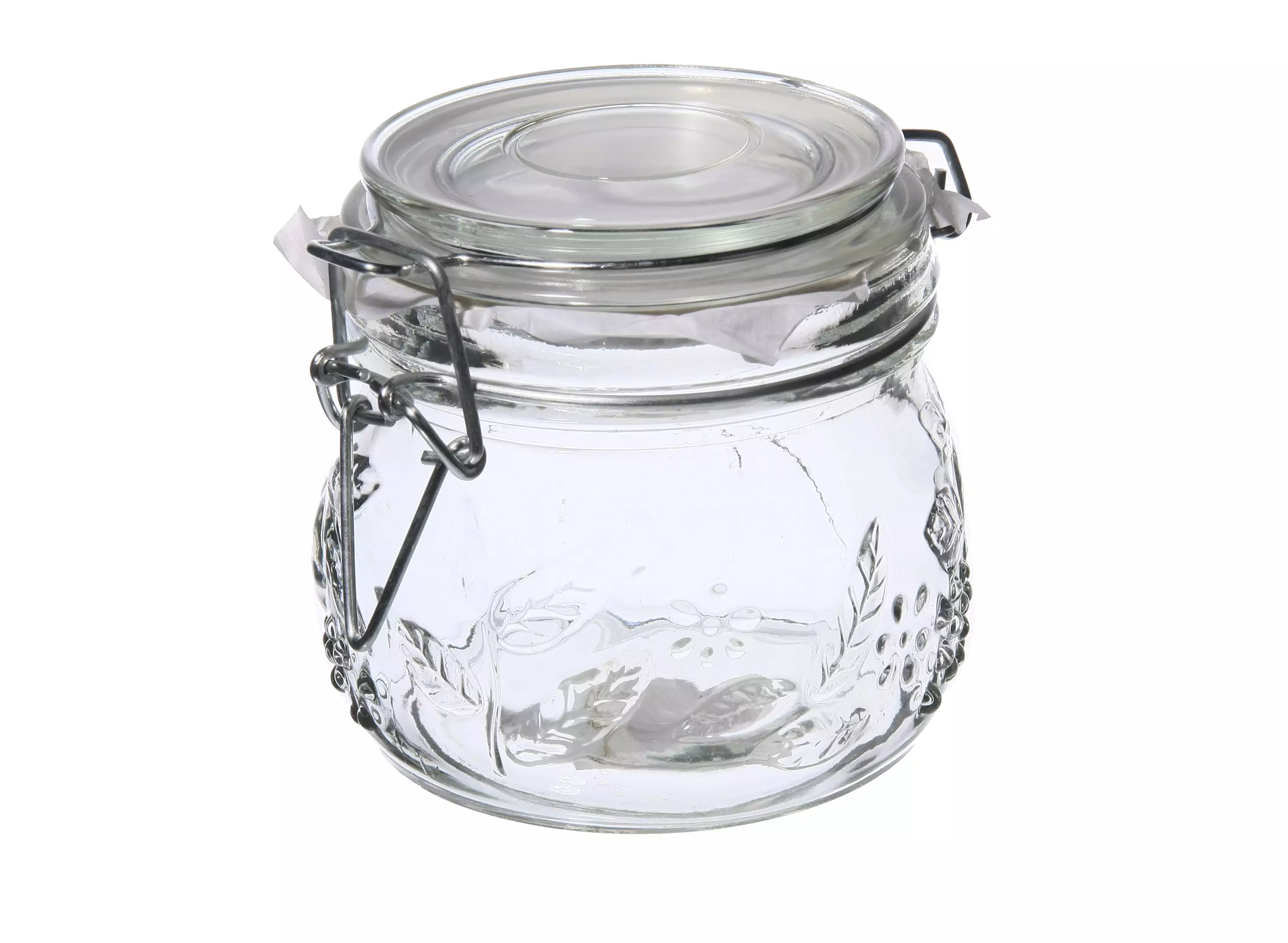 Lasipurkki sopii säilöntään ja kuiva-aineiden säilytykseen. Tiiviissä purkissa sisältö säilyy tuoreena pidempään. Patenttikannessa on silikonitiiviste ja purkki on koristeltu kohokuvioin. Lämmönkesto 60 astetta. Käsinpesu.