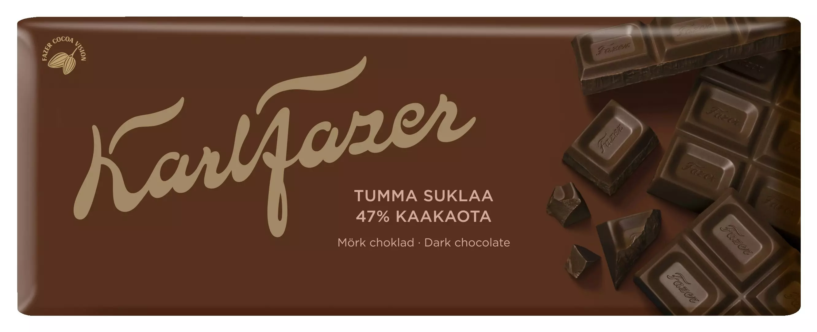 Kaikki Karl Fazer -suklaat valmistetaan hienoimmasta Arriba-kaakaosta parhaalla ammattitaidolla. Pehmeässä ja suussasulavassa Karl Fazer -tummassa suklaassa on vahva kaakaon maku, joka tekee hetkestä juhlan. Noudatamme kaakaonhankinnassamme Fazerin kaakaovisiota. Lue lisää www.fazercocoavision.com. Jaa suklaalevy ystävien kanssa tai anna itsellesi herkullinen hetki. Vähälaktoosinen.