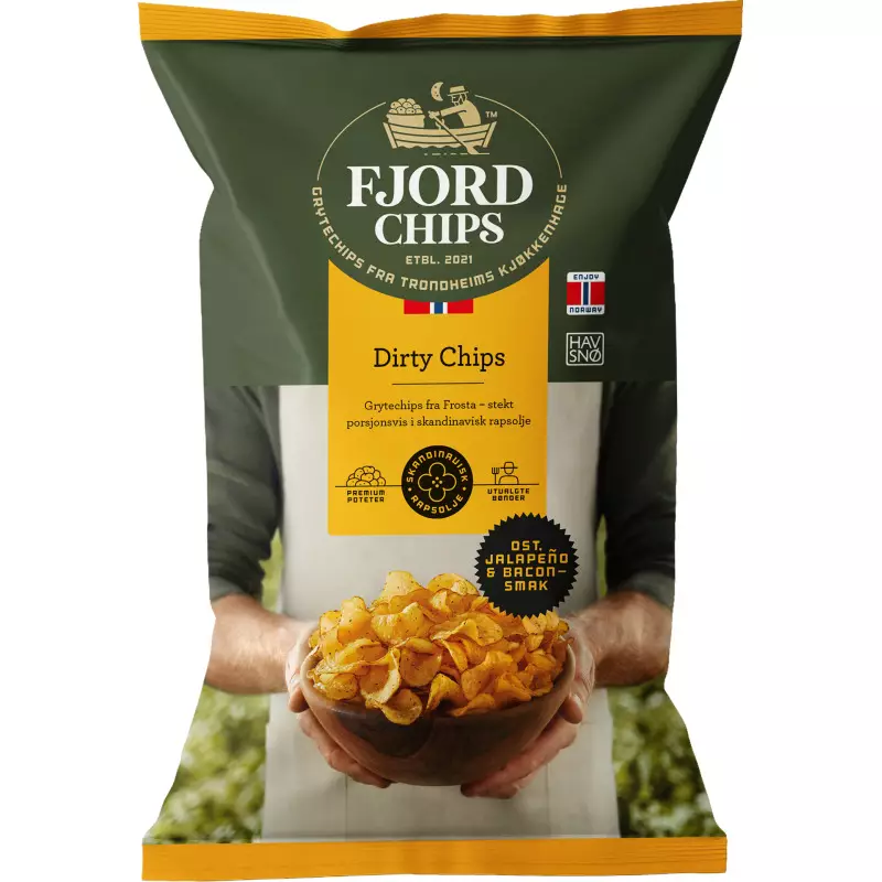 FjordChips Dirty Chips -sipsit tarjoavat monivivahteisen makumaailman, jossa juuston pehmeys, jalapeñon sopiva tulisuus ja savuinen pekonimainen aromi täydentävät toisiaan. Lopputulos on suolainen, mausteinen ja hieman savuisen paahteinen kokonaisuus.