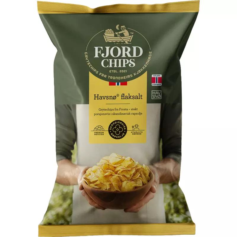 FjordChips perunalastut Havsnø-merisuolalla (perunalastut, sipsit, merisuolasipsit) tarjoavat aidon ja puhtaan makuelämyksen. Klassiset, suolaiset sipsit valmistetaan vain muutamasta tarkoin valitusta raaka-aineesta – makua enemmän ilman turhia lisäaineita.