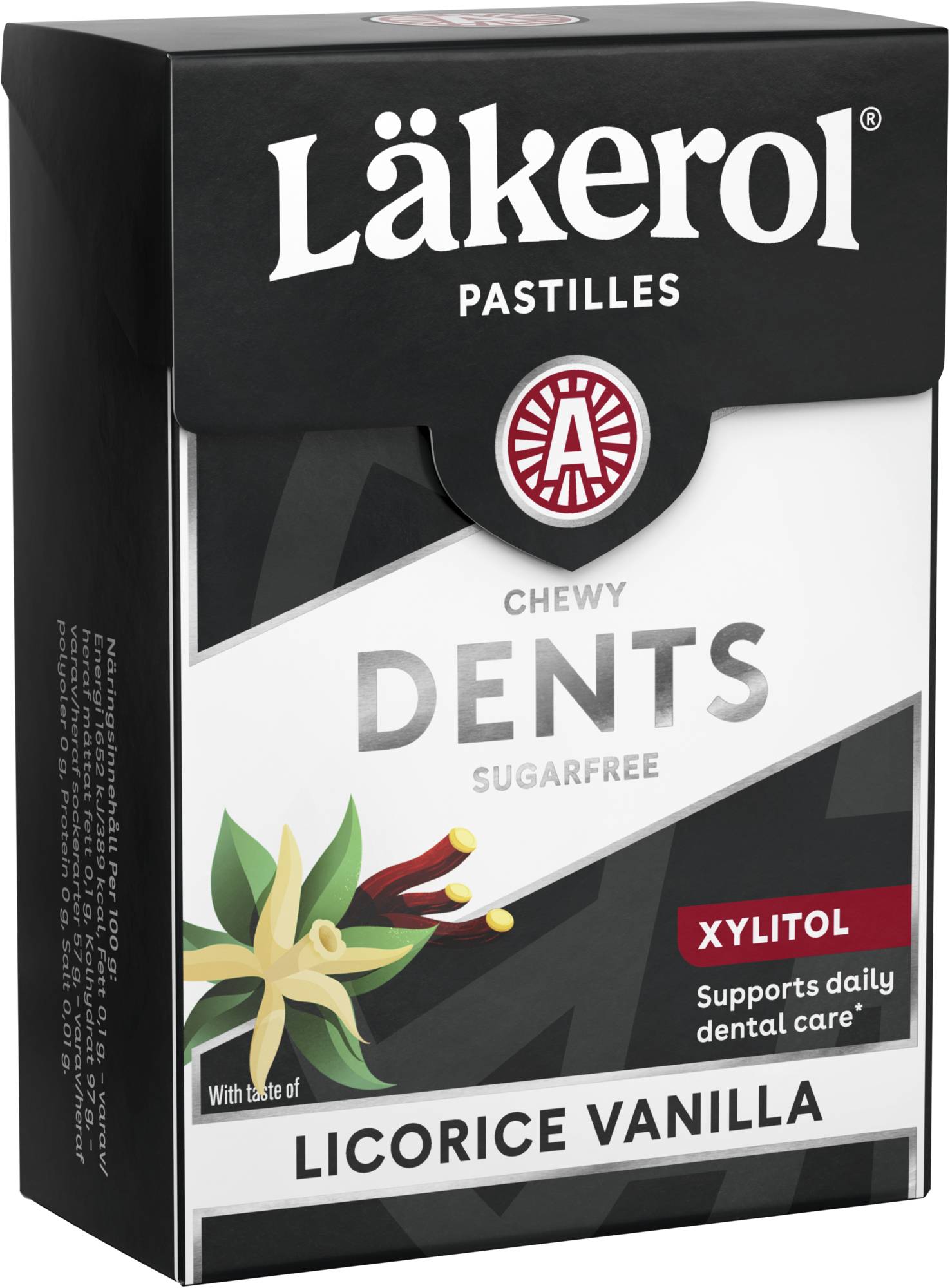 Läkerol Dents Liquorice Vanilla on herkullinen lakritsin ja vaniljan makuinen ksylitolipastilli. Pastilleissa on ainutlaatuinen pureskeltavan pehmeä koostumus. Ksylitolia ja maltitolia sisältävien pastillien nauttiminen edistää hampaiden mineralisaation ylläpitämistä. Mineralisaatio tarkoittaa hammaskiilteen kovettumista.