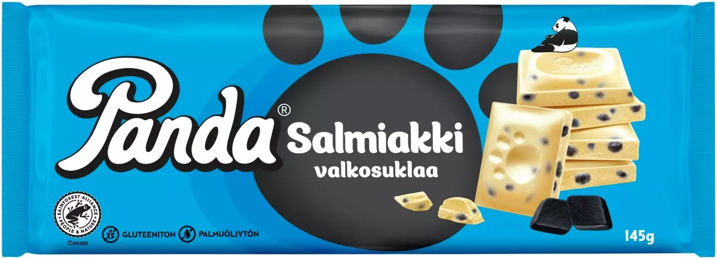 Avainsanat: valkosuklaa, salmiakki, lakritsi, makeinen, suklaalevy, Panda, herkku, suomalainen suklaa