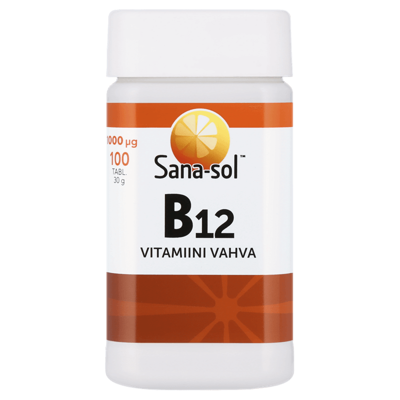 Sana-sol 1000ug B12-vitamiinitabletti. Tabletti on nyt mantelinmuotoinen, sen ansiosta tabletti on helpompi niellä kuin pyöreä. Uusi tablettimuoto on kliinisesti testattu. Sana-sol B12-vitamiini sisältää B12-vitamiinia vahvana pitoisuutena. B12-vitamiini edistää hermoston normaalia toimintaa ja normaaleja psykologisia toimintoja. Se myös auttaa vähentämään väsymystä ja uupumusta ja edistää immuunijärjestelmän normaalia toimintaa. Suositeltava vuorokausiannos aikuisille 1 tabletti vuorokaudessa. Ilmoitettua suositeltua vuorokausiannosta ei saa ylittää. Ravintolisä ei korvaa monipuolista ja tasapainoista ruokavaliota eikä terveitä elämäntapoja. Tuote on säilytettävä pienten lasten ulottumattomissa.