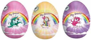 Suklaamunien kääreitä koristaa suloiset yksisarvihahmot jotka ovat suosittuja lasten keskuudessa.