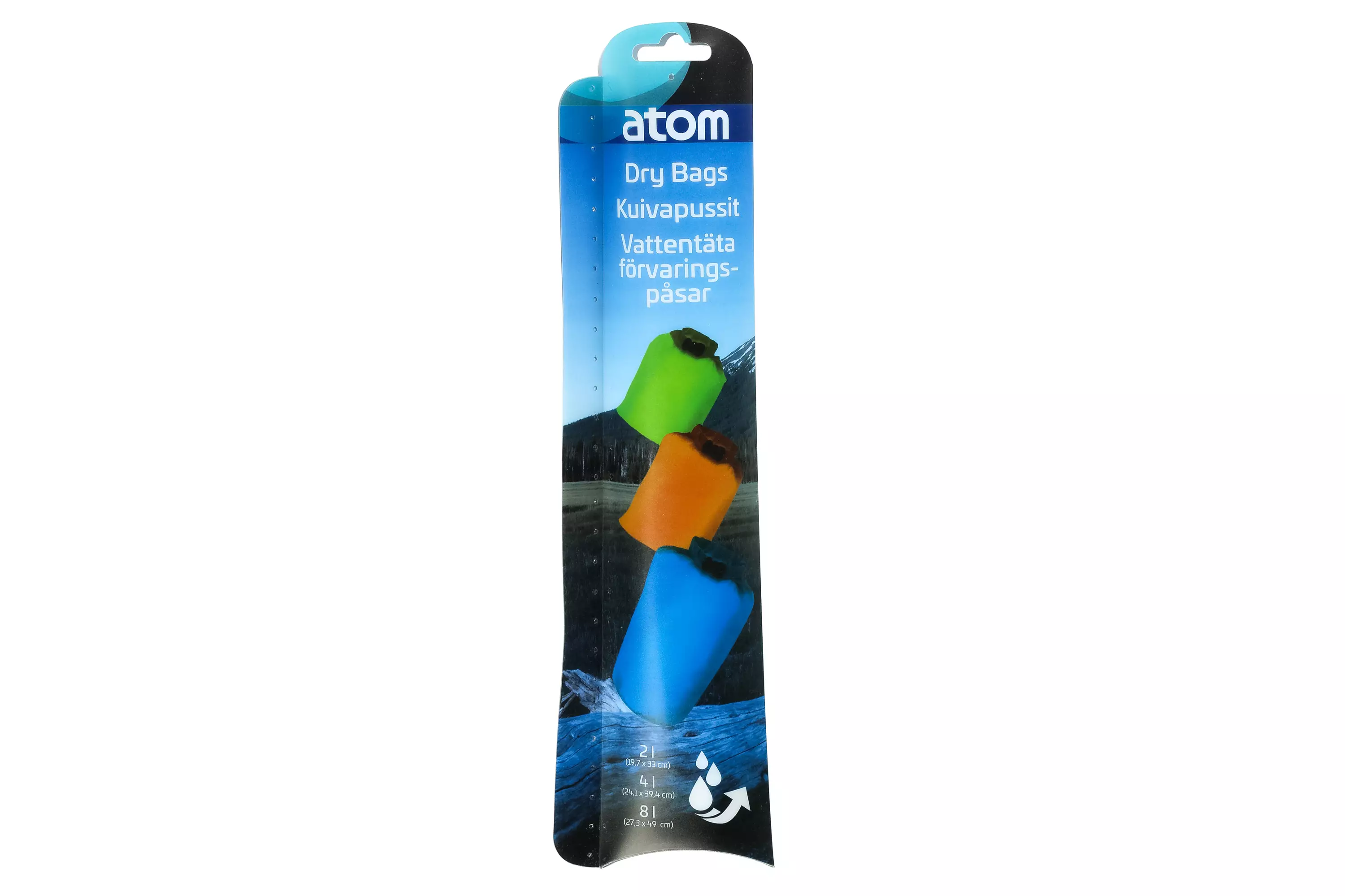 Erittäin kevyet, säänkestävät kuivapussit. Suojaa vaatteet ja tekniset laitteet kosteudelta. Kolme eri kokoa 2 L (19,7 x 33 cm), 4 L (24,1 x 39,4 cm) ja 8 L (27,3 x 49 cm). Rullattava yläosa.