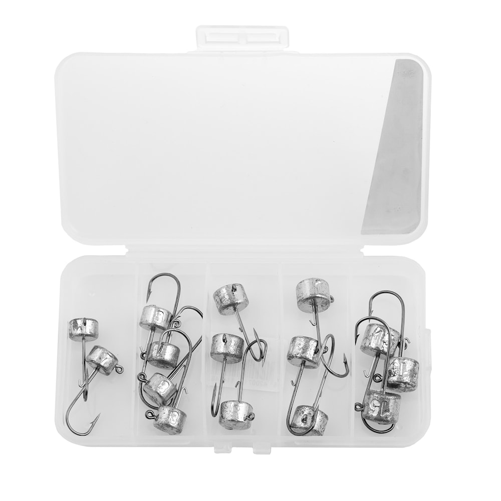 Veka Ned jigipäälajitelma hakasella. Ned jigipää kääntää kelluvan jigin ylöspäin pohjasta. Tämä lajitelma on suunniteltu ahvenjigeille ja se sisältää myös säilytysrasian jigipäille!... Lue lisää