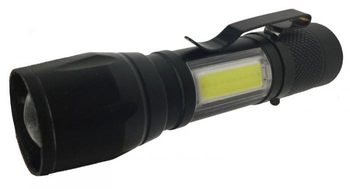 Ladattava minitaskulamppu 115 lumenia. Superkirkas 250 / 115 Lum, Teleskooppizoomi, Alumiinikotelo, Taskuklipsi kääntyy 360°, 3 toimintoa: ON/COB ON/OFF, Käyttöaika 2 h, latausaika 2 h, 400 mAh 14500 paristo mukana, Micro USB latausjohto mukana, CE
