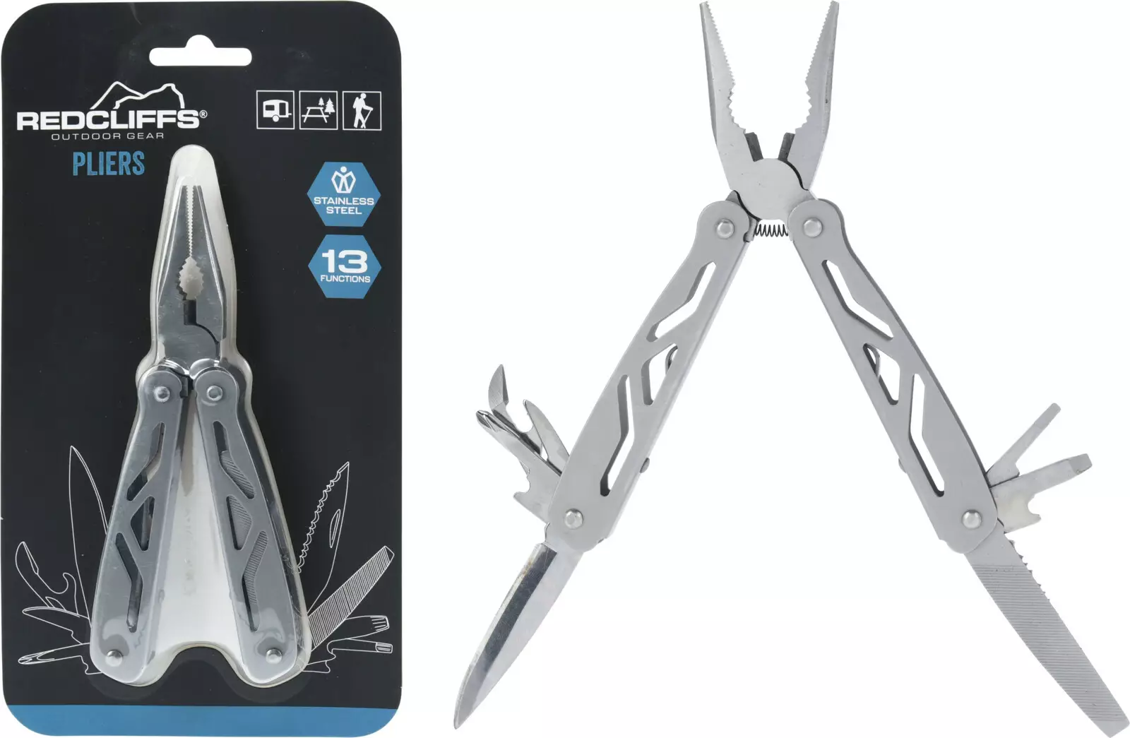 •Toiminnot: 13 eri toimintoa, kuten veitsi, puristin, ruuvimeisselit, tölkin avaus, pullonavaaja ja paljon muuta