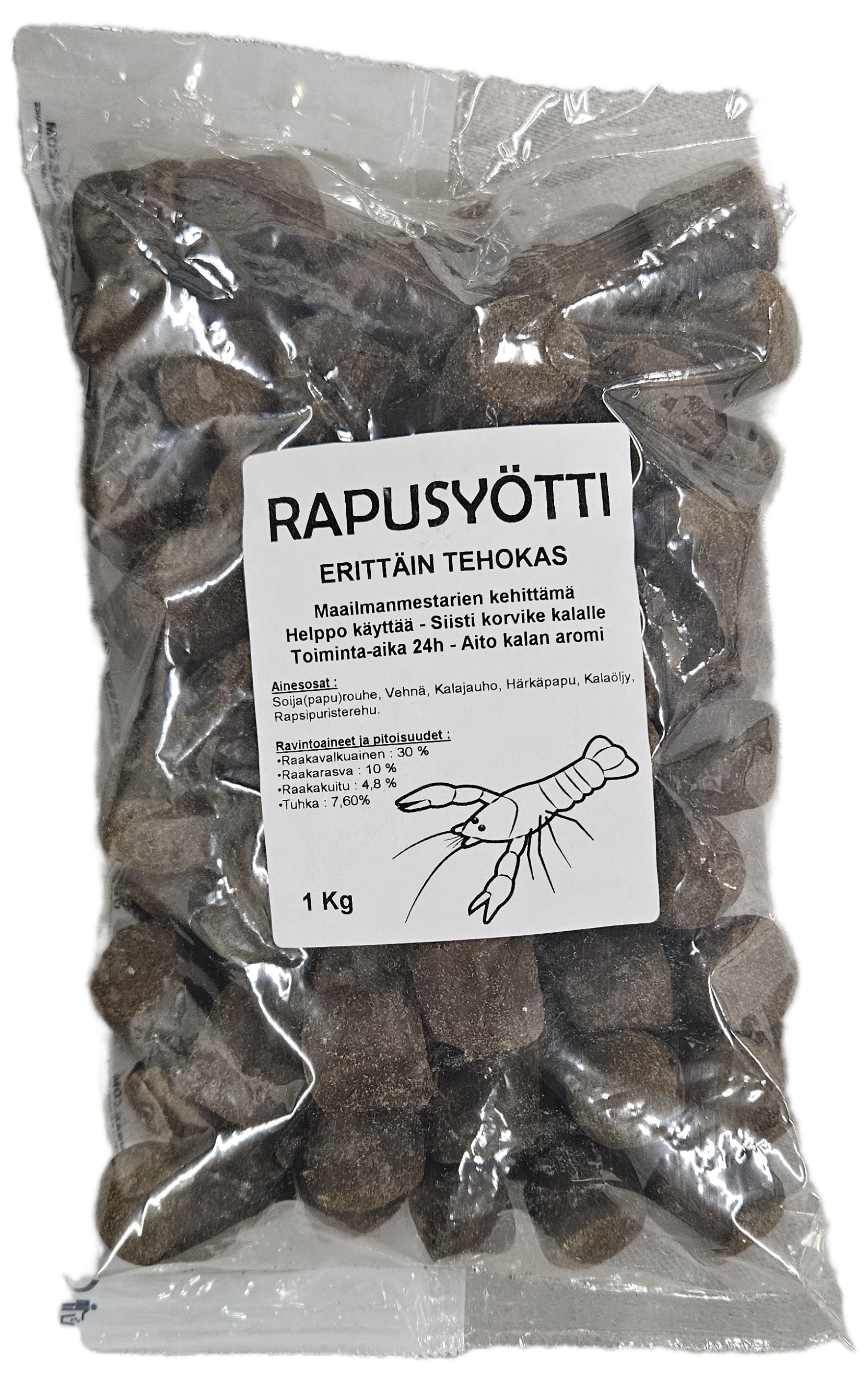 ERITTÄIN TEHOKAS Maailmanmestarien kehittämä Helppo käyttää -Siisti korvike kalalle Toiminta-aika 24h - Aito kalan aromi Ainesosat Soija (papu)rouhe, Vehnä, Kalajauho, Härkäpapu, Kalaolly Rapsipuristerehu. Ravintoalneet ja pitoisuudet: 'Raakavalkuainen :30 % .Raakarasva :10 % "Raakakuitu : 4,8 % .Tuhka 7.60%