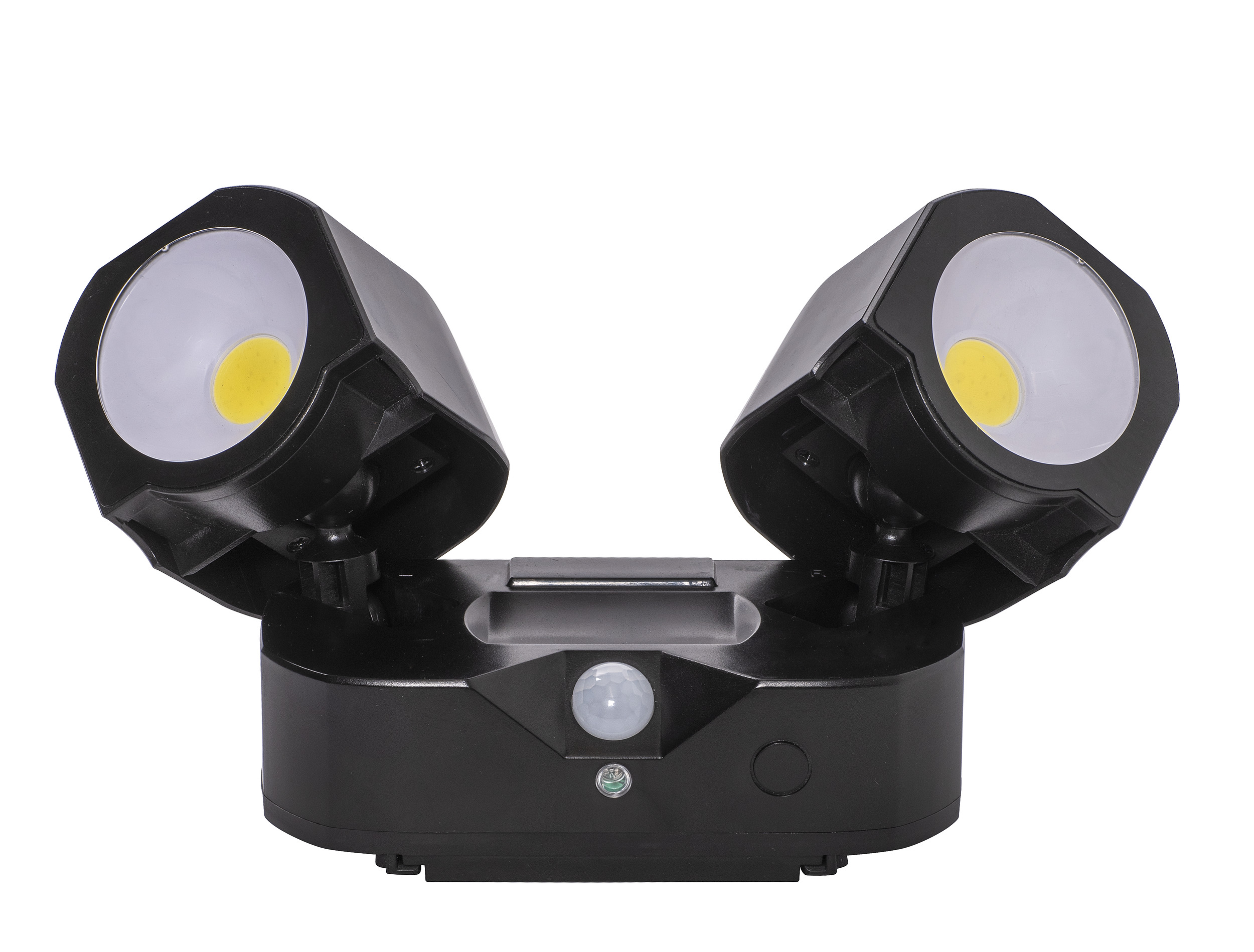 Sensor paristovalaisin IP44. Valonlähde 2 x 2 W COB LED, ei vaihdettava. 230lm. Valo 100%, off. Liiketunnistin ja hämäräkytkin. PIR-anturin havainnointikulma < 100°, havainnointietäisyys < 8 m. Virtalähde 3 x AA. Valaisuaika 4h. Runko muovia. Musta.