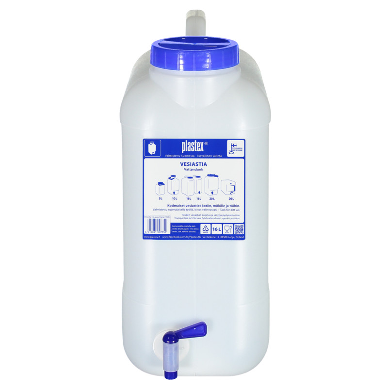 Laadukas kotimainen hanallinen vesiastia. Astia on helppo pestä ison suuaukon ansiosta ja helppo kuljettaa kantokahvasta. Sopii veden lisäksi hyvin mm. myös mehulle, kotiviinille, kotikaljalle. Vesiastia soveltuu mm. mökille, veneeseen, retkeilyyn, matkailuautoon, työmaalle ja vesikatkosten aikana juomaveden kuljetukseen. Kuljetus ja säilytys pystyasennossa. Kääntöhana on laitettava sivuasentoon kuljetuksen ajaksi. Kannessa on sulkemista ja avaamista varten syvennykset, jotta korkin kiertäminen on vaivatonta. Kannessa on kuminen tiiviste ja se on valmistettu elintarvikekelpoisesta muovista. Tilavuus 16L. Elintarvikekäyttöön. Valmistettu Lohjalla. BPA-vapaa.
