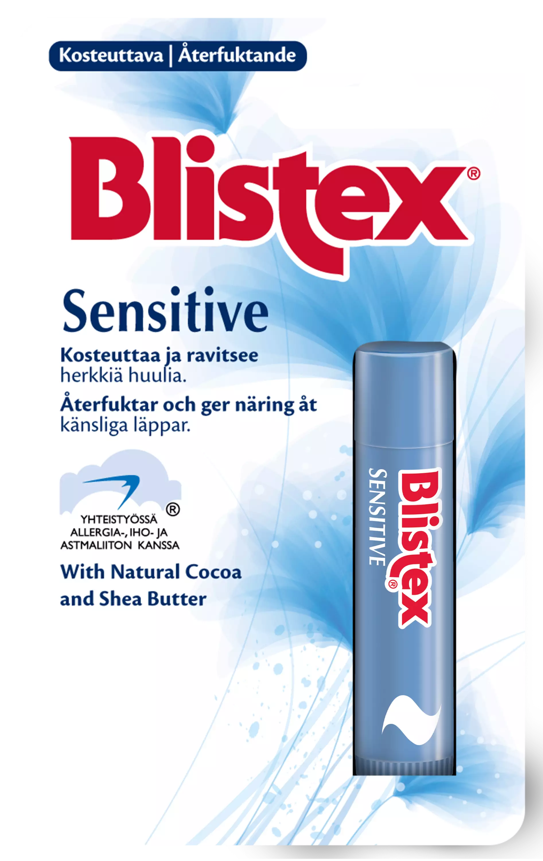 Blistex Sensitive on hellävarainen huulivoide herkille huulille. Vain viisi ainesosaa, luonnollinen kaakao- ja sheavoi kosteuttavat ja ravitsevat. Kehitetty yhteistyössä Allergia-, Iho- ja Astmaliiton kanssa. Hajusteeton, mauton ja väritön.