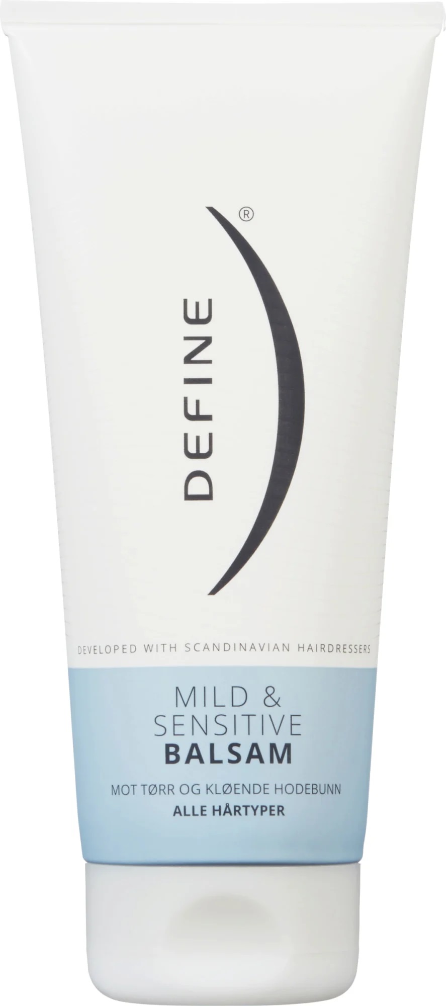 Define Mild & Sensitive hoitoaine on mieto ja hajusteeton. Se hoitaa hiuksia ja sisältää päänahkaa tasapainottavia prebiootteja. Ehkäisee hilsettä. Dermatologisesti testattu herkälle iholle. Define Mild & Sensitive hoitoaine on vegaaninen, eikä se sisällä silikonia. Define-tuotesarja on kehitetty yhteistyössä skandinaavisten kampaajien kanssa.