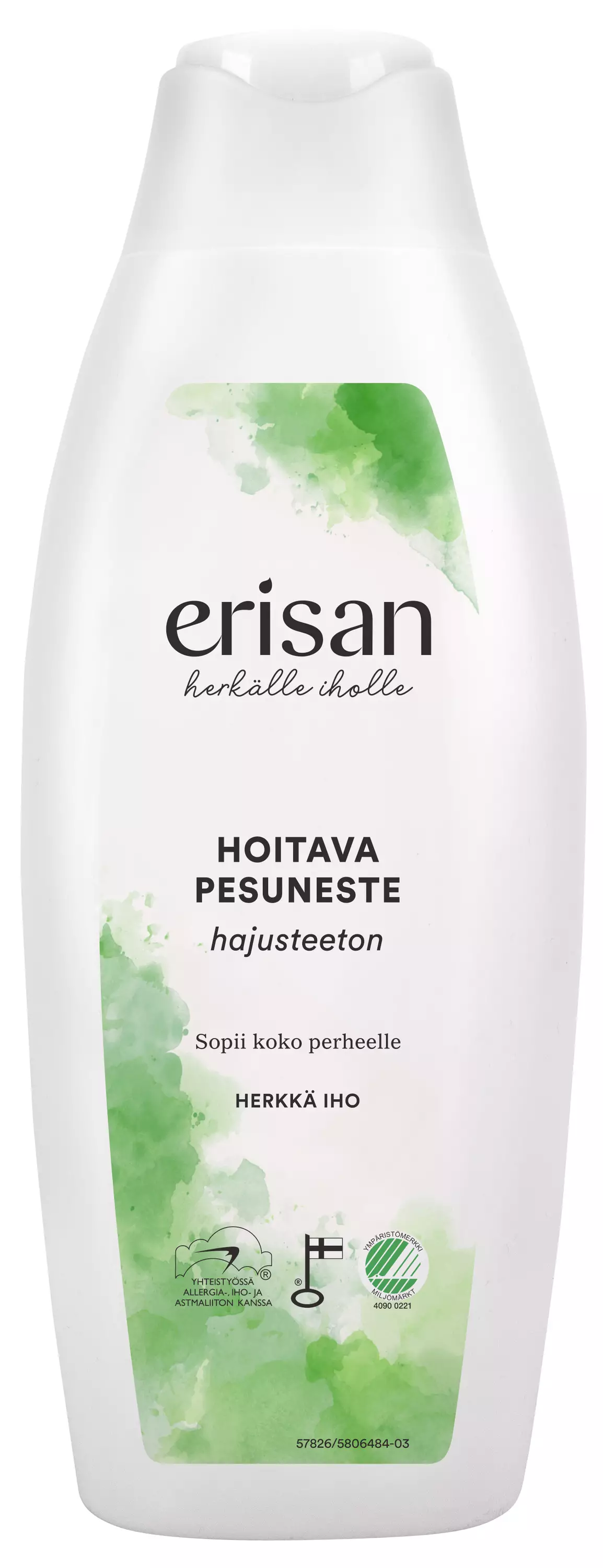 Erisan Hoitava Pesuneste puhdistaa koko perheen herkän ihon hellävaraisesti. Pesunesteessä on käytetty tutkittuja ja turvallisia ainesosia, jotka hoitavat ja suojaavat herkkää ihoa sekä säilyttävät ihon normaalin kosteustasapainon. Tuote sopii usein toistuvaan pesuun. Tuote on kehitetty yhteistyössä Allergia-, Iho- ja Astmaliiton kanssa eikä se sisällä hajusteita, väriaineita eikä parabeeneja. Tuote valmistetaan Suomessa.