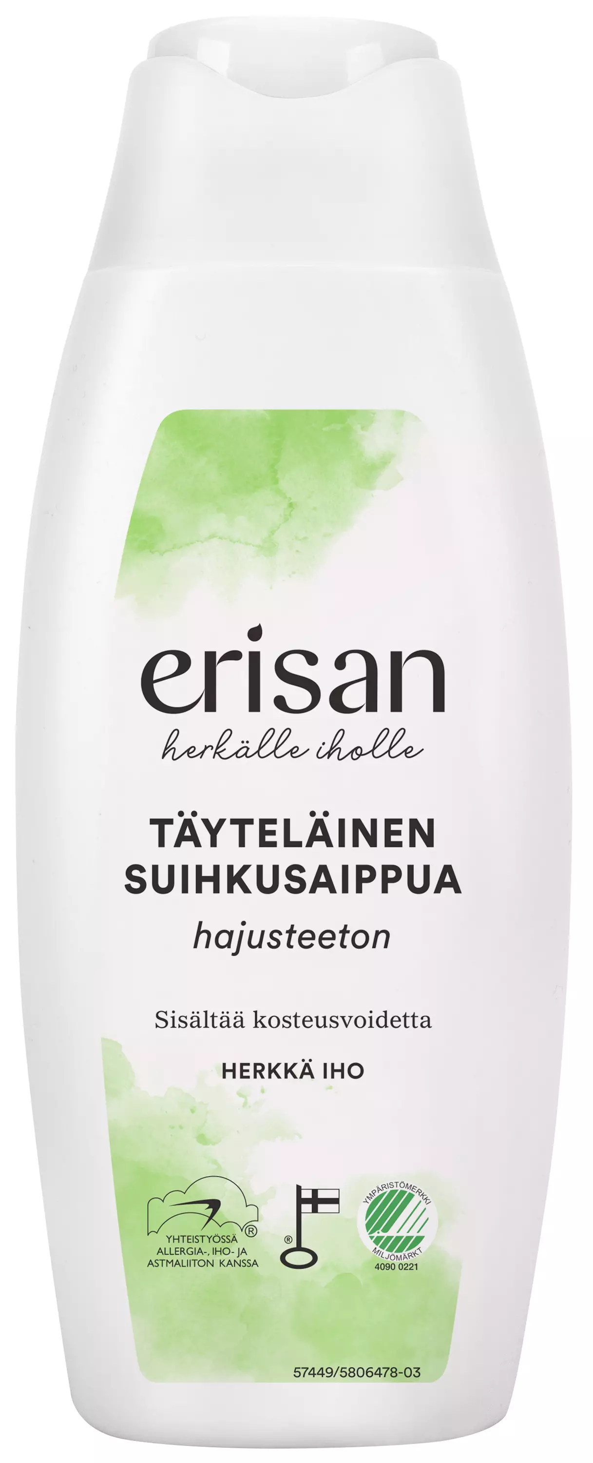 Erisan Täyteläinen Suihkusaippua puhdistaa koko perheen herkän ihon hellävaraisesti. 33 % kosteusvoidetta sisältävä, pehmeästi vaahtoava koostumus tekee ihosta samettisen pehmeän ja joustavan. Sopii usein toistuvaan pesuun. Tuote on kehitetty yhteistyössä Allergia-, Iho- ja Astmaliiton kanssa eikä se sisällä hajusteita, väriaineita eikä parabeeneja. Tuote valmistetaan Suomessa.