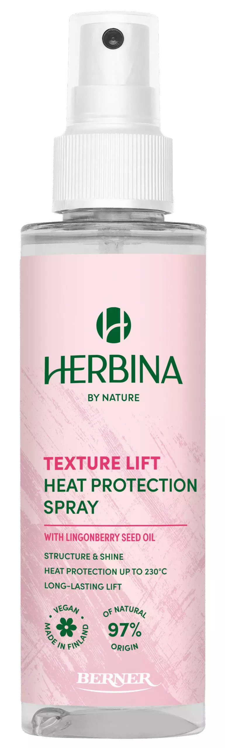 Herbina Texture Lift Heat Protection Spray lämpösuojasuihke suojaa hiuksia tehokkaasti muotoilurautojen, kihartimen ja föönin aiheuttamilta vaurioilta jopa 230 °C asti. Tuote helpottaa hiusten muotoilua ja antaa kampaukselle rakennetta. Pohjoismaista puolukansiemenöljyä sisältävä lämpösuojasuihke auttaa tekemään hiuksista luonnollisen pehmeät, kiiltävät ja hyvinvoivan näköiset. Herkullisen marjaisa tuoksu.