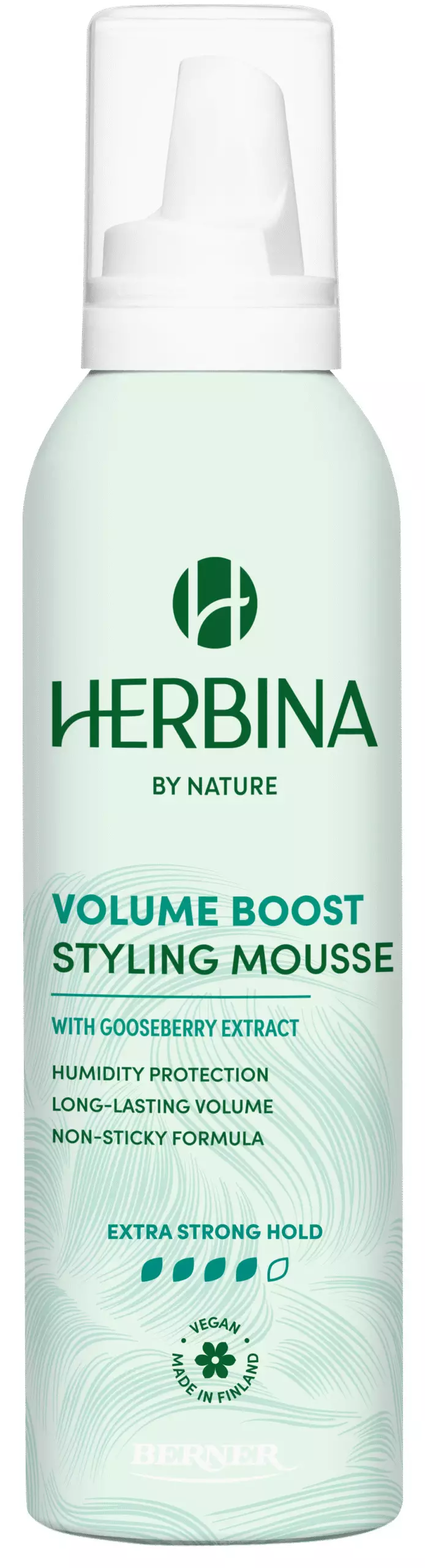 Herbina Volume Boost Styling Mousse muotovaahto antaa tuuheutta ja pitkäkestoista tukea kampaukselle hiuksia latistamatta. Koostumus tekee hiuksista ilmavat ja kauniin kiiltävät sekä auttaa vähentämään hiusten pörröisyyttä ja sähköisyyttä. Muotovaahto sisältää karviaisuutetta, betaiinia ja pantenolia. Tuotteen sisältämä lämpösuoja suojaa hiuksia lämpökäsittelyn rasituksilta. Raikkaan hedelmäinen tuoksu.