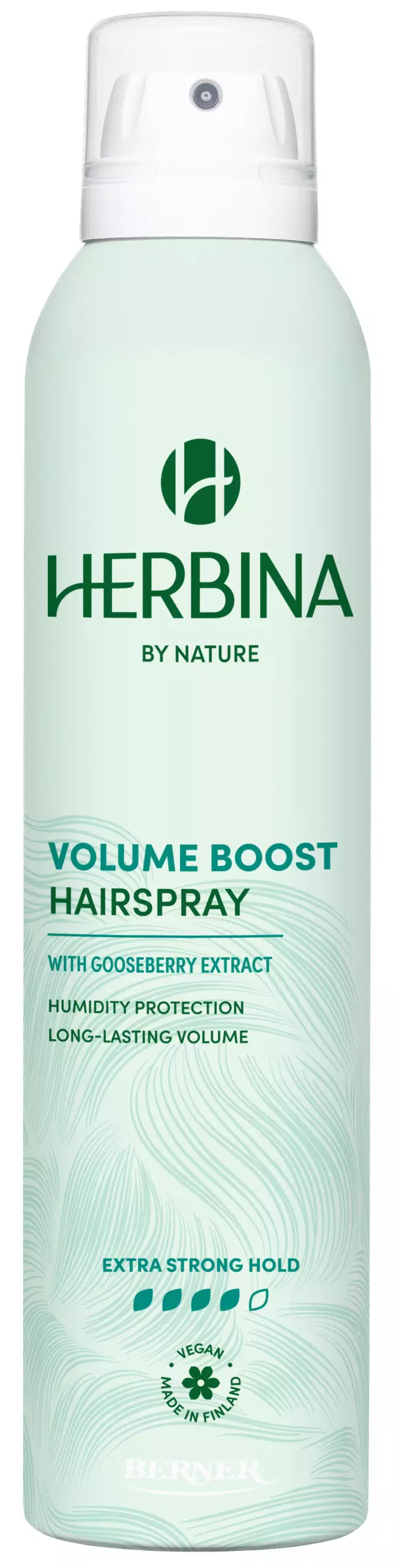 Herbina Volume Boost Hairspray hiuskiinne antaa pitkäkestoista volyymia ja joustavaa pitoa jopa 24 tunniksi. Nopeasti kuivuva, tahmaamaton koostumus sopii hiustyylin muotoiluun ja luonnolliseen viimeistelyyn. Karviaisuutetta sisältävä hiuskiinne antaa hiuksille erinomaisen suojan kosteutta ja pörröisyyttä vastaan. Raikkaan hedelmäinen tuoksu.