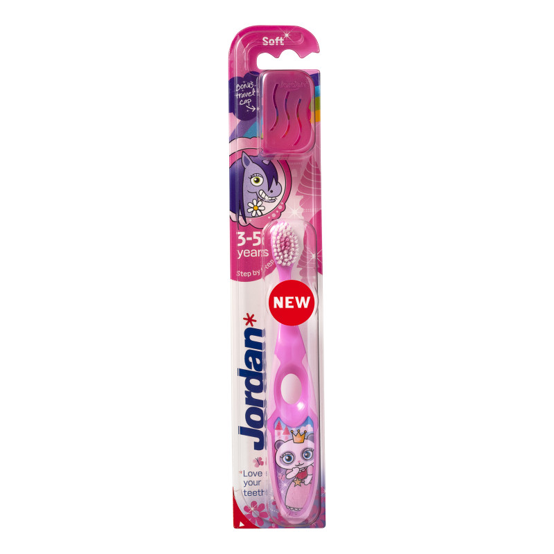 Jordan Step by Step 3-5 -vuotiaiden hammasharjassa on pehmeä ja entistä tuuheampi harjaspää. Muotoillusta kahvasta saa hyvän ja pitävän otteen. Harjaspään siniset harjakset auttavat annostelemaan oikean määrän hammastahnaa. Valitse suosikkisi 4 eri hahmoista ja väreistä. Pakkauksen mukana saat joko tiimalasin tai matkakotelon.