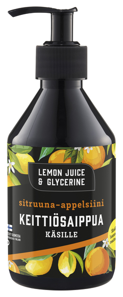 Lemon Juice & Glycerine Keittiösaippua käsille on pirteän sitruunan ja appelsiinin tuoksuinen käsisaippua keittiöön. Se sisältää ihoa kosteuttavaa glyseriiniä, ja pesee kädet tehokkaasti mutta hellästi, kuivattamatta ihoa. Sitruksinen tuoksu ja luonnollisella maitohapolla säädetty pH auttavat poistamaan käsistä voimakkaita ruoanlaitossa syntyviä hajuja. Biohajoava koostumus. Tuote on valmistettu Suomessa ja sille on myönnetty kotimaisen työn Avainlippu-tunnus.
