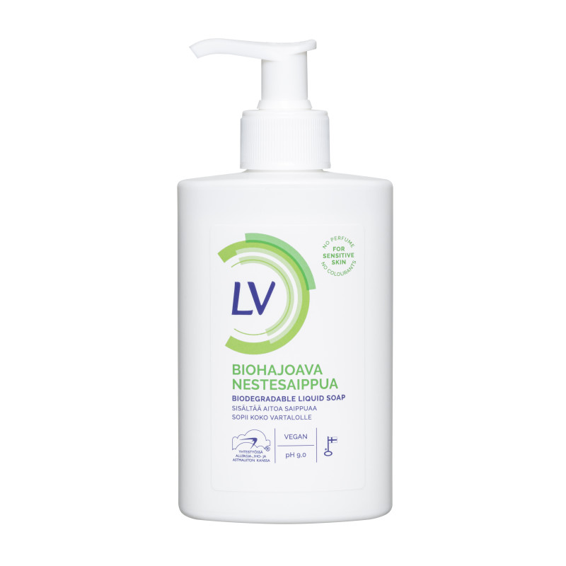 Hajusteeton ja väriaineeton LV Biohajoava -käsisaippua on luontoa kunnioittava vaihtoehto kotiin ja mökille. Aitoa saippuaa sisältävä tuote sopii käsien ja myös vartalon pesuun koko perheelle. Saippua soveltuu erinomaisesti myös herkälle iholle. Hellävaraisille LV-tuotteille on myönnetty Allergia- ja Astmaliiton tunnus. Pakkauskoko 300 ml.