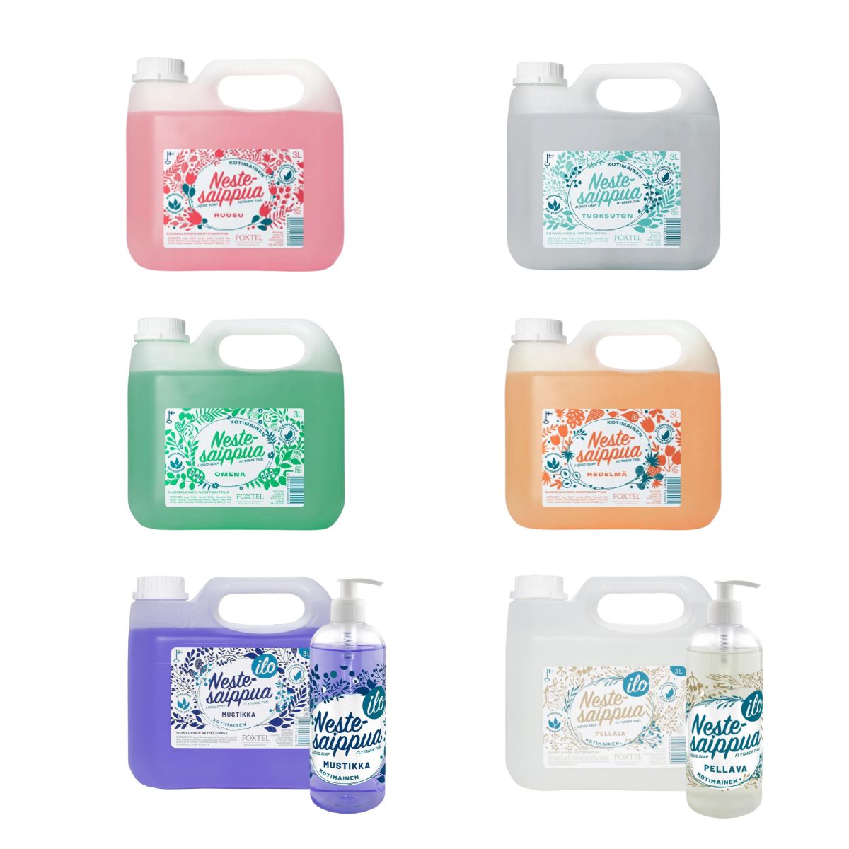 Hellävaraisista uuden polven raaka-aineista valmistetut kotimaiset nestesaippuat käsien ja koko vartalon pesuun. Mukana myös tuoksuton vaihtoehto.