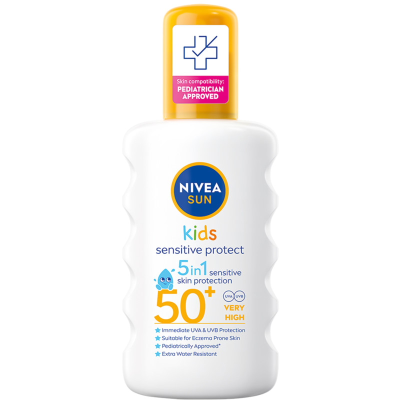Lasten herkälle iholle kehitetty Nivea Sun Kids Sensitive Protect & Play SK50+ on iholle suihkutettava aurinkovoide. Sen korkeat UVA- ja UVB-suodattimet antavat tehokkaan suojan auringon haittavaikutuksilta ja vähentävät aurinkoallergian riskiä. Suihke imeytyy nopeasti ja se sisältää ihoa hoitavaa ja kosteuttavaa aloe veraa. Hyvä vedenkestävyys.