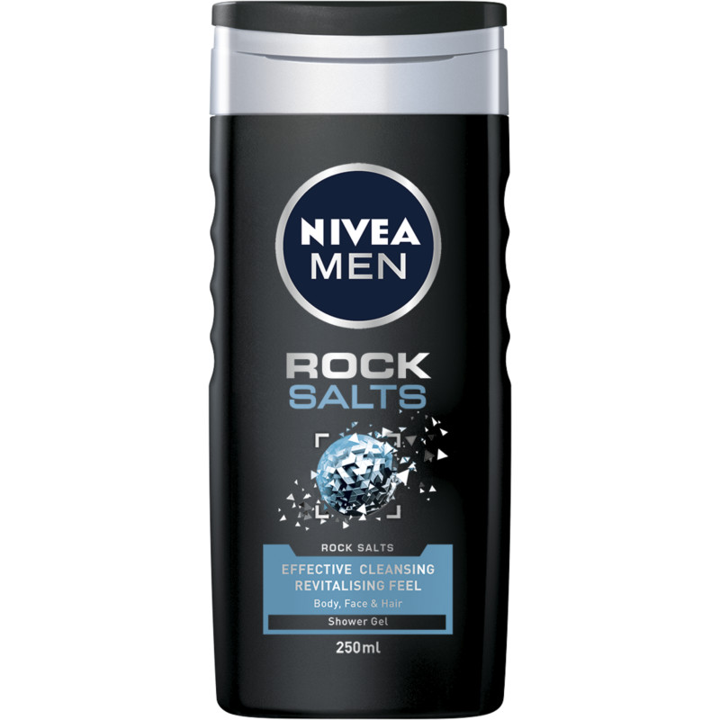 Nivea Men Rock Salts suihkugeelin puhdistava koostumus sisältää rouhittua vuorisuolaa. Iholle jää erittäin virkistynyt, raikas ja puhdas tunne! Tuotteessa on miehekäs ja hieman puinen tuoksu. Suihkugeeli soveltuu käytettäväksi koko keholle, hiuksille ja kasvoille. Suihkugeelissä on iholle optimaalinen pH-arvo. Tuotteen koostumus on dermatologisesti testattu. Pakkauskoko 250 ml.