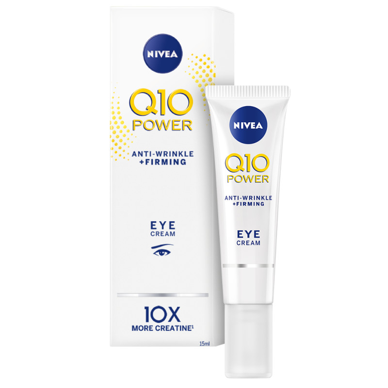 Nivea Q10plus Anti-Wrinkle Eye Care -silmänympärysvoide tasoittaa näkyvästi juonteita ja vähentää tummia silmänalusia. Kevyt, nopeasti imeytyvä ja hajusteeton silmänympärysvoide sisältää ihon omaa Q10-koentsyymiä ja kreatiinia, jotka tekevät ihosta tasaisemman, sileämmän ja kauniimman. Säännöllisesti käytettynä voide auttaa ehkäisemään uusien ryppyjen muodostumista ja ennenaikaista vanhenemista. Voide on kehitetty erityisesti herkälle silmänympärysiholle ja se soveltuu myös piilolinssien käyttäjille. Pakkauskoko 15 ml.