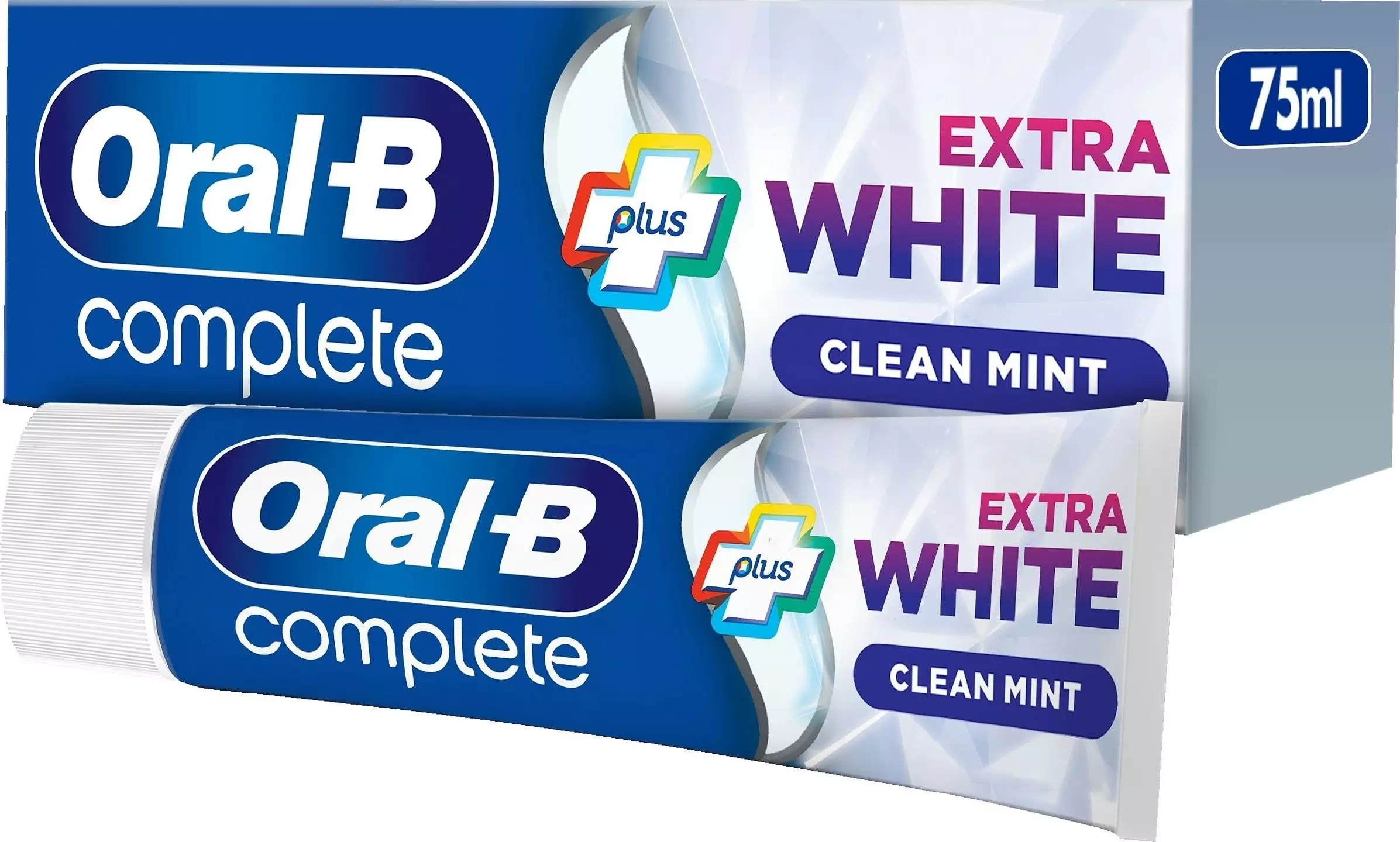 Oral-B Complete Extra White -hammastahna valkaisee ja poistaa pinnallisia värjäytymiä, raikastaa hengityksen, puhdistaa ja suojaa reikiintymiseltä.