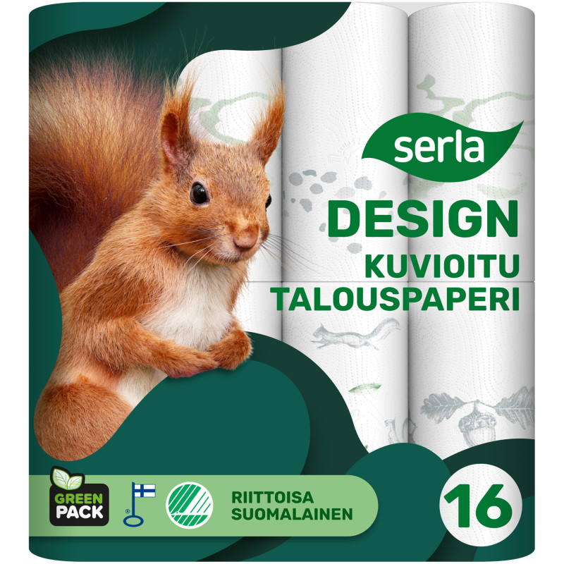 Serla Design on Suomen suosituinta talouspaperia kauniisti kuvioituna. Serla Design talouspaperilla pyyhit pitkään kodin tahrat ja kommellukset, sillä se on imukykystä ja vahvaa. Tämä paperi näyttää hyvältä ja on ympäristölle fiksu: ympärillä Green Pack -kääre, jonka materiaaleista vähintään 50 % on kierrätettyä muovia. Valmistettu suomalaisesta ensikuidusta ja kierrätetystä kuidusta Mäntän paperitehtaalla.