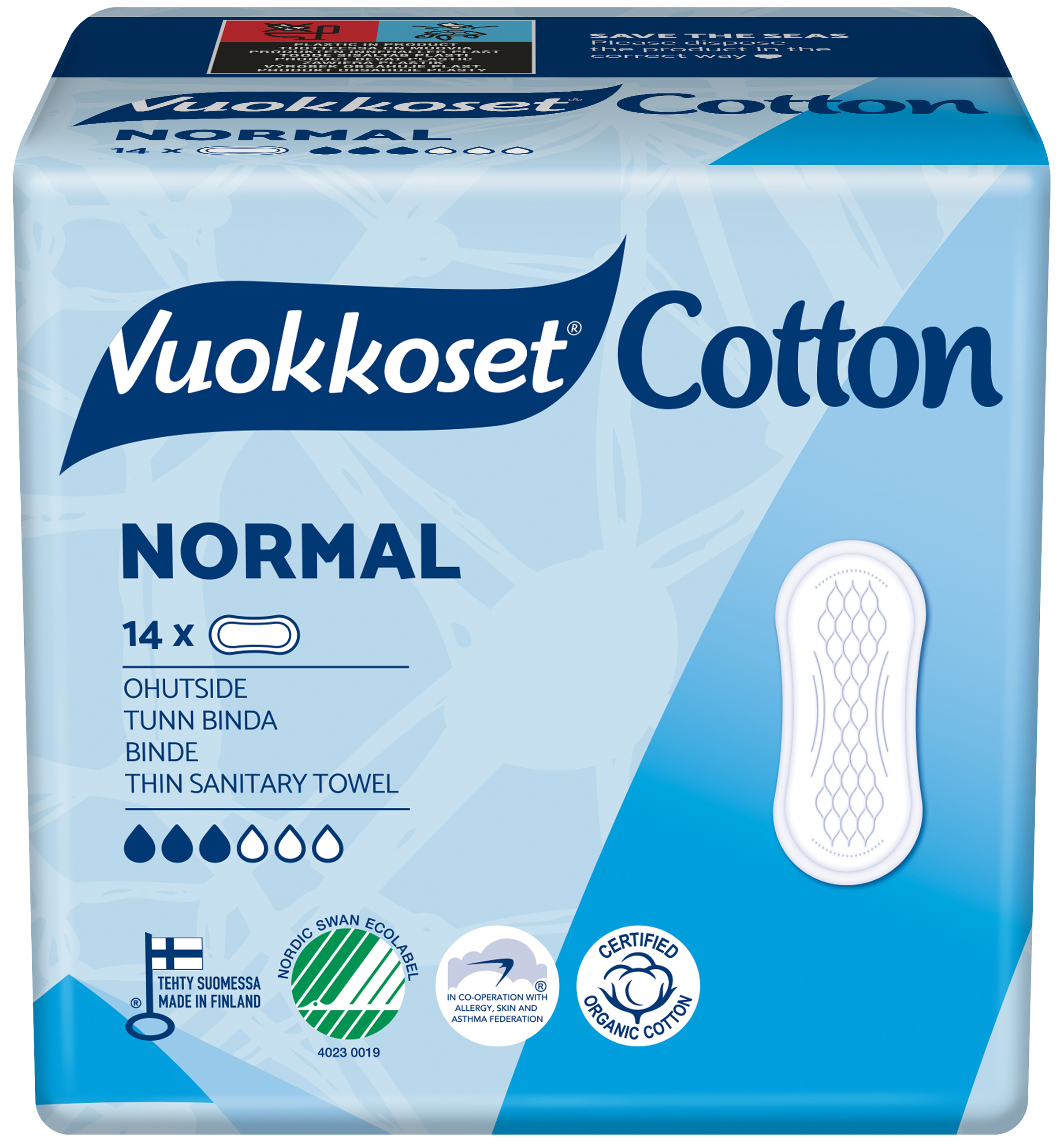 Vuokkoset Cotton Normal on hellävarainen siivetön ohutside. Imukykyinen side on kehitetty erityisesti herkälle iholle. Siteen pinta on aitoa 100% luomupuuvillaa ja ne tuntuvatkin sen ansiosta erityisen ihoystävällisiltä ja hengittäviltä ihoasi vasten. Vuokkoset Cotton on ensimmäinen naisten hygieniatuotesarja, jolle on myönnetty Allergia- ja Astmaliiton tunnus. Vuokkoset siteet ovat yksittäispakattuja. Tuotteessa ei ole lisättyjä hajusteita tai kemikaaleja.