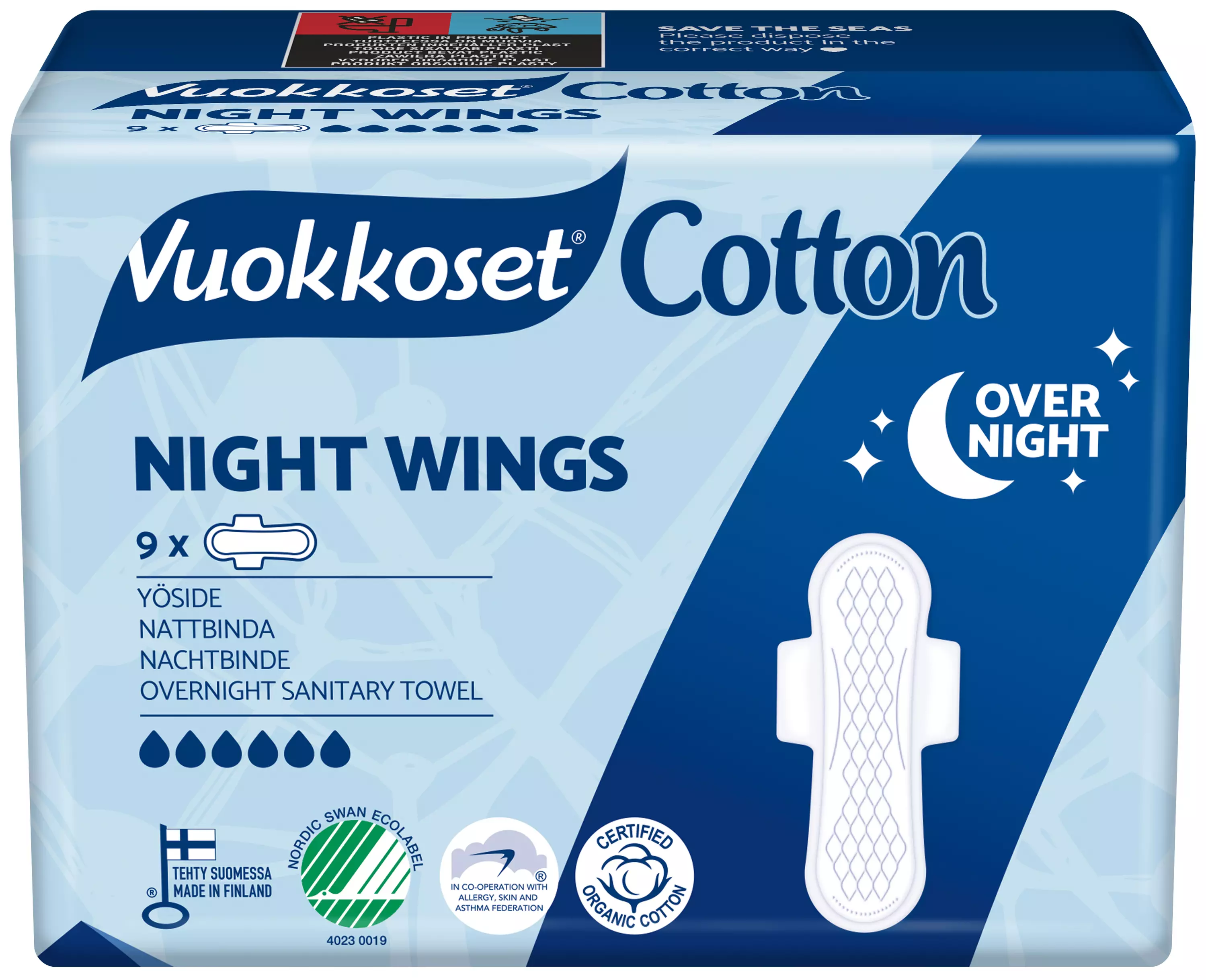 Vuokkoset Cotton Night Wings on hellävarainen ja erityisen imukykyinen, siivellinen ohutside, joka on kehitetty erityisesti yökäyttöön. Siteen pinta on aitoa 100% luomupuuvillaa ja ne tuntuvatkin sen ansiosta erityisen ihoystävällisiltä ja hengittäviltä ihoasi vasten. Vuokkoset Cotton on ensimmäinen naisten hygieniatuotesarja, jolle on myönnetty Allergia- ja Astmaliiton tunnus. Vuokkoset siteet ovat yksittäispakattuja. Tuotteessa ei ole lisättyjä hajusteita tai kemikaaleja.