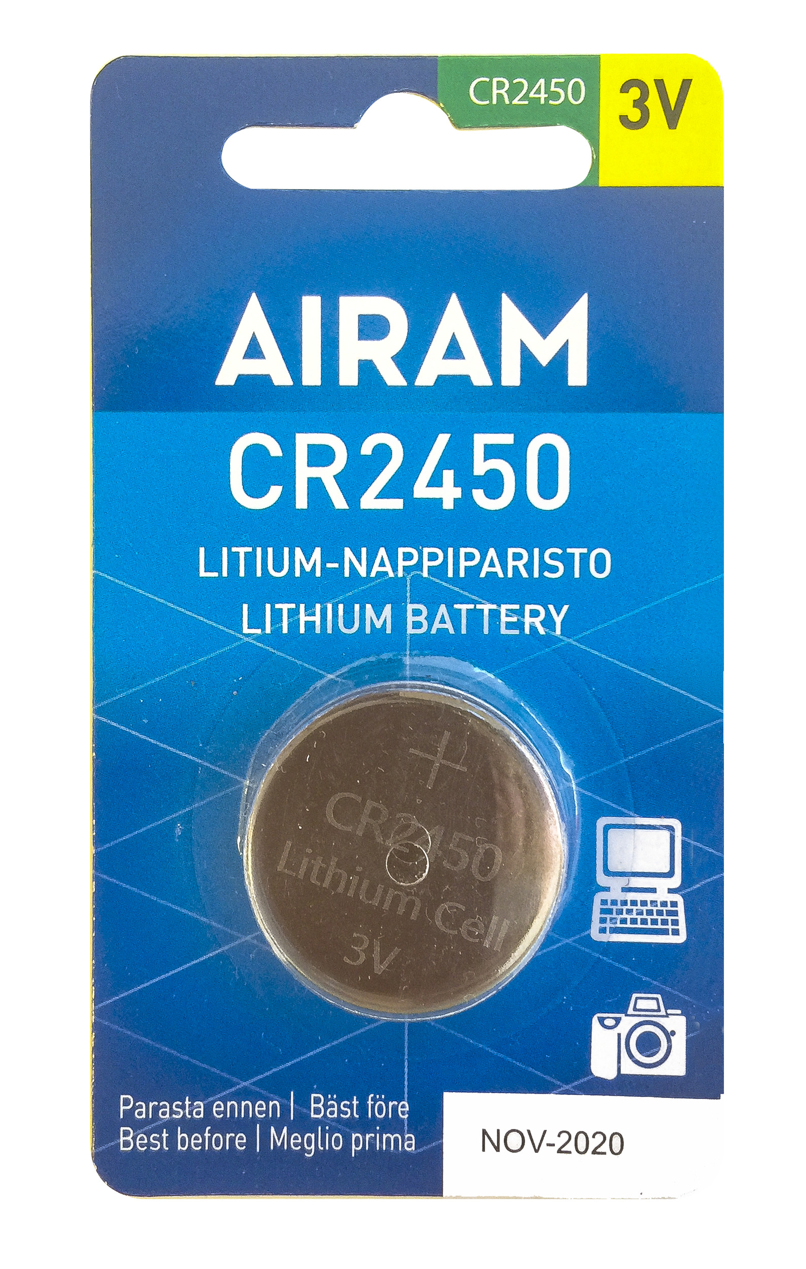 Litiumparisto Airam CR2450, 3V 1BL. Litiumparistojen elinikä on pitkä, minkä vuoksi niitä käytetään elektroniikassa, kelloissa, kameroissa ja muistivarmennuksessa. Toimii jopa alle -20°C lämpötilassa.