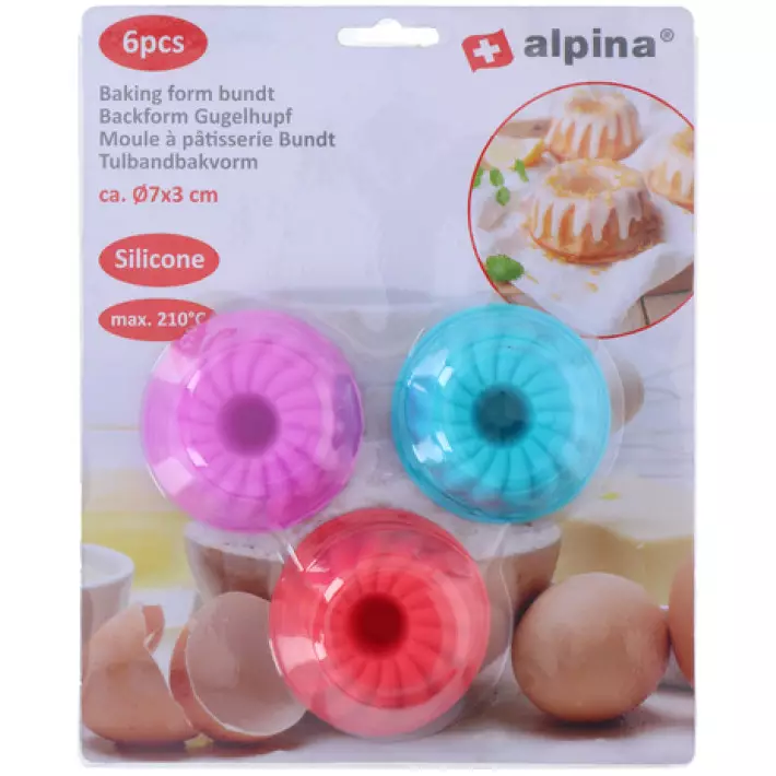 Tee kauniita ja tasaisesti paistuneita pikkukakkuja helposti Alpina silikonisilla mini-Bundt -leivontavuoilla. Setti sisältää 6 kappaletta yksittäisannoskokoisia vuokia, joilla valmistat näyttävät kahvikakut, muffinssit ja muut herkut.