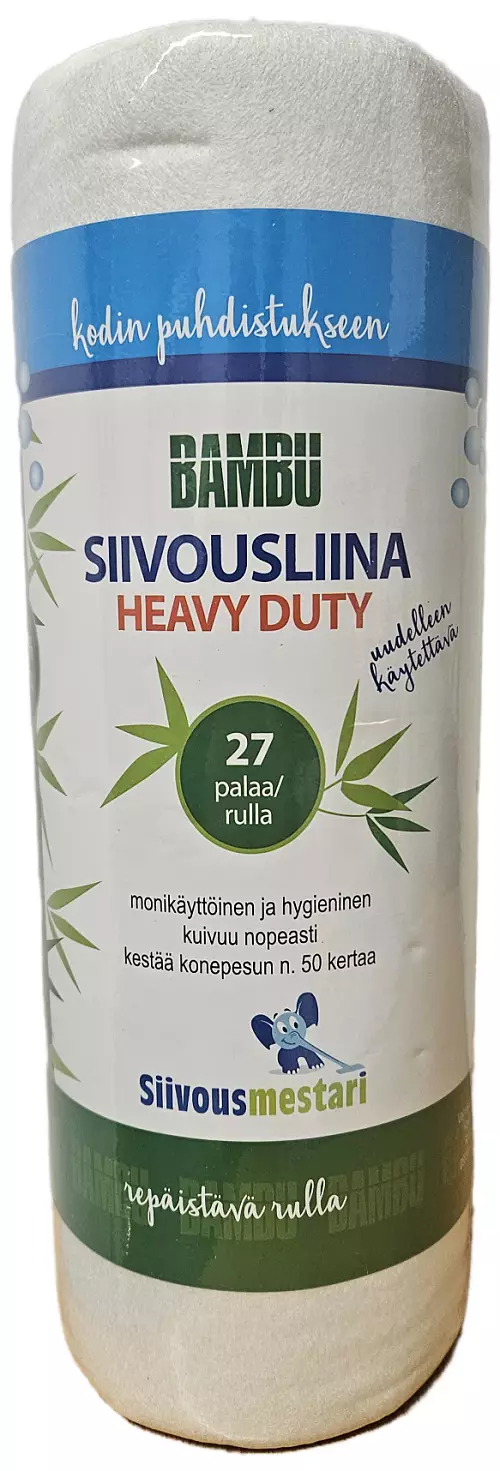 Kodin Puhdistukseen HEAVY DUTY BAMBU SIIVOUSLIINA Uudelleen käytettävä, liinan koko: 28x30cm väri: valkoinen materiaali: bambukuitu 100% 27 palaa/ rulla Pesu 60 asteessa Ei saa silittää. Rumpukuivaus kielletty. Älä käytä huuhtelu tai valkaisuaineita. Kestää konepesun n. 50 kertaa. monikäyttöinen ja hygieninen kuivuu nopeasti. Reäistävä rulla.