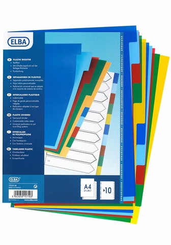 10-osainen värillinen A4-kokoinen välilehti. Erittäin kestävä. Valmistettu polypropyleenista.