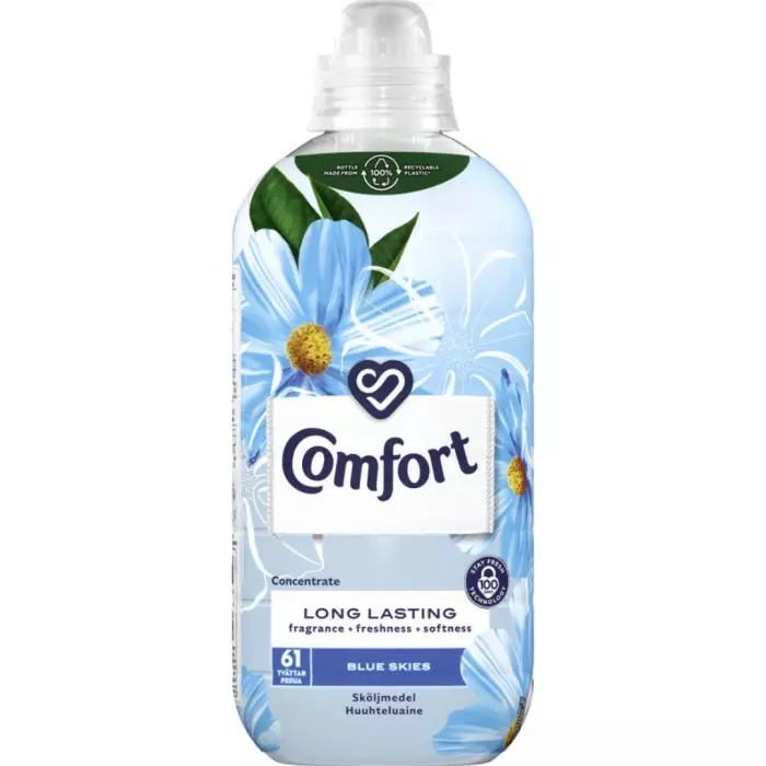 Comfort-huuhteluaine Blue Skies tekee pyykistäsi pehmeää ja jättää vaatteillesi raikkaan tuoksun. Blue Skiesin tuoksussa on vihreän omenan päätuoksu, ruusun keskituoksu ja santelipuun pohjatuoksu, ja se jättää pyykkiisi raikkaan tuoksun. Comfort-huuhteluaineella on pehmentävä vaikutus ja se auttaa silottamaan vaatteiden kuituja ja tekemään niistä erityisen pehmeät, poistamaan ryppyjä ja helpottamaan silittämistä. Se torjuu staattista sähköä ja auttaa säilyttämään vaatteiden värin ja muodon. Comfort-huuhteluaine Blue Skiesin koostumus suojaa vaatteitasi pahoilta hajuilta, joten ne tuntuvat raikkailta pidempään ja jättää pitkäkestoisen tuoksun. Huuhteluaine on tiivistettyä, mikä tekee pakkauksesta ja annostuksesta pienemmän. 925 ml:n pullo riittää 61 pesukertaan. Pakkaus on valmistettu 100 % kierrätetystä muovista.