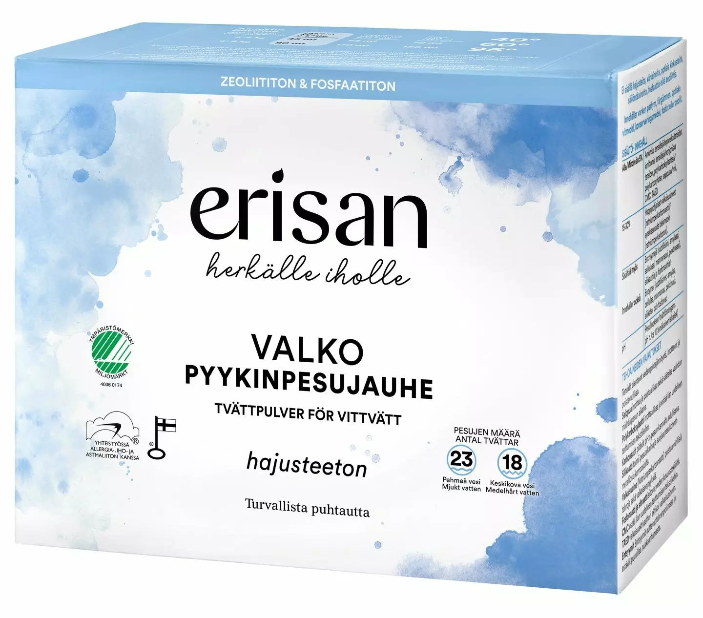 Hajusteeton Erisan Valko Pyykinpesujauhe poistaa tehokkaasti lian ja tahrat valkopyykistä 40-95 asteen lämpötiloissa. Tuotteessa on hyvä valkaisuteho jo 40 asteen lämpötilassa. Pesujauhe huuhtoutuu hyvin tekstiileistä. Sopii myös vauvanpyykille. Tuote ei sisällä hajusteita, väriaineita, fosfaattia eikä zeolittiia. Erisan Pyykinpesujauheen pesuaktiiviset aineet ovat biologisesti hajoavia ja pakkaus on valmistettu kierrätyskelpoisesta materiaalista.