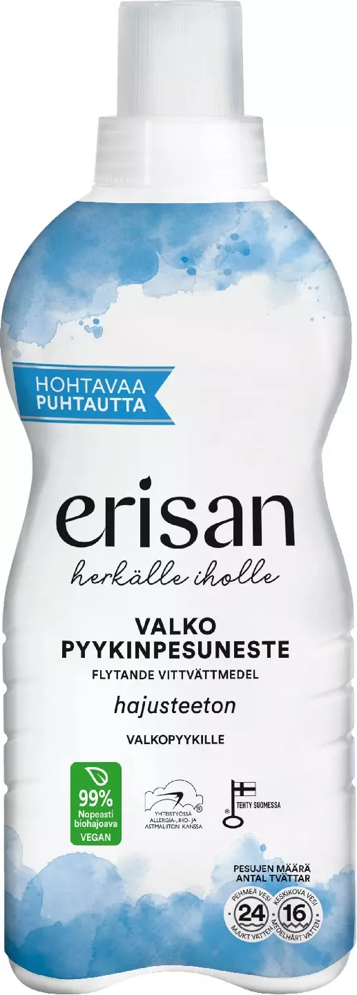 Erisan Valko pyykinpesuneste on suunniteltu erityisesti valkoisten ja vaaleiden tekstiilien pesuun. Se puhdistaa tehokkaasti mutta hellävaraisesti ja auttaa estämään pyykin harmaantumista. Pesuaine toimii hyvin jo matalissa pesulämpötiloissa ja huuhtoutuu tehokkaasti tekstiileistä.