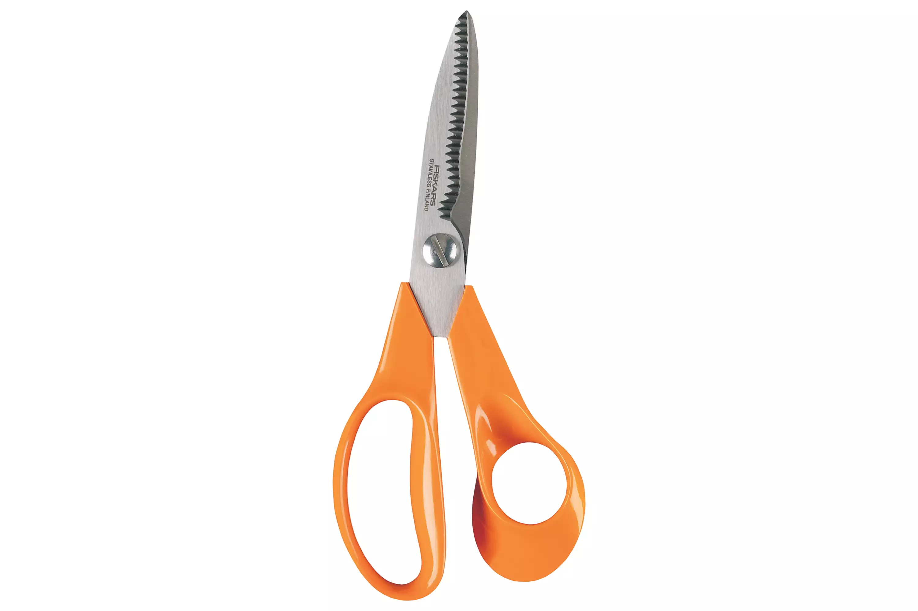 Fiskars Classic keittiösakset (18 cm) ruoka-ainesten käsittelyyn ja pakkausten avaamiseen. Hammastetut ja kiristettävät terät pitävät leikkauskohteen paikoillaan. Oranssikahvaiset Classic... Lue lisää