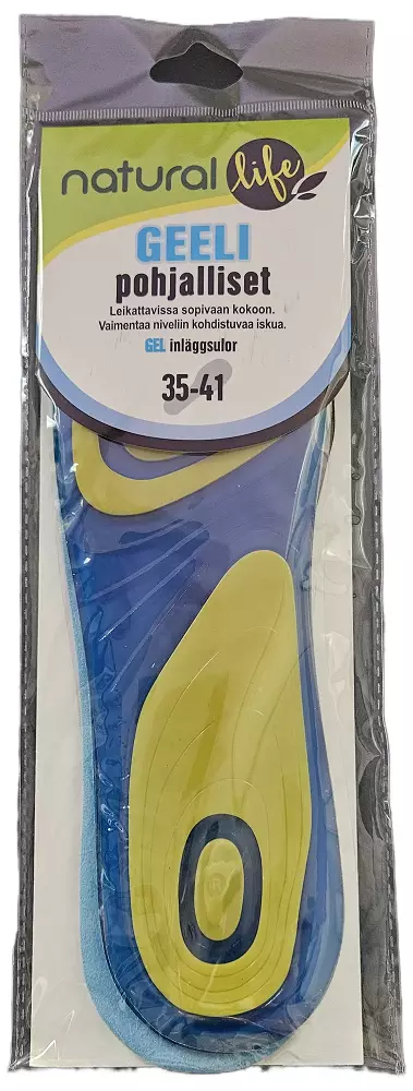 Iskua vaimentavat pohjalliset TRP-geelistä. Erinomainen apu tasapohjaisiin, huonosti vaimentaviin kenkiin. Pohjallinen keventää painetta kantapään ja päkiän alla. Pohja ei luista kengässä, ja yläpuoli tuntuu pehmeältä. Helppo leikata haluttuun kokoon. Käsinpesu.