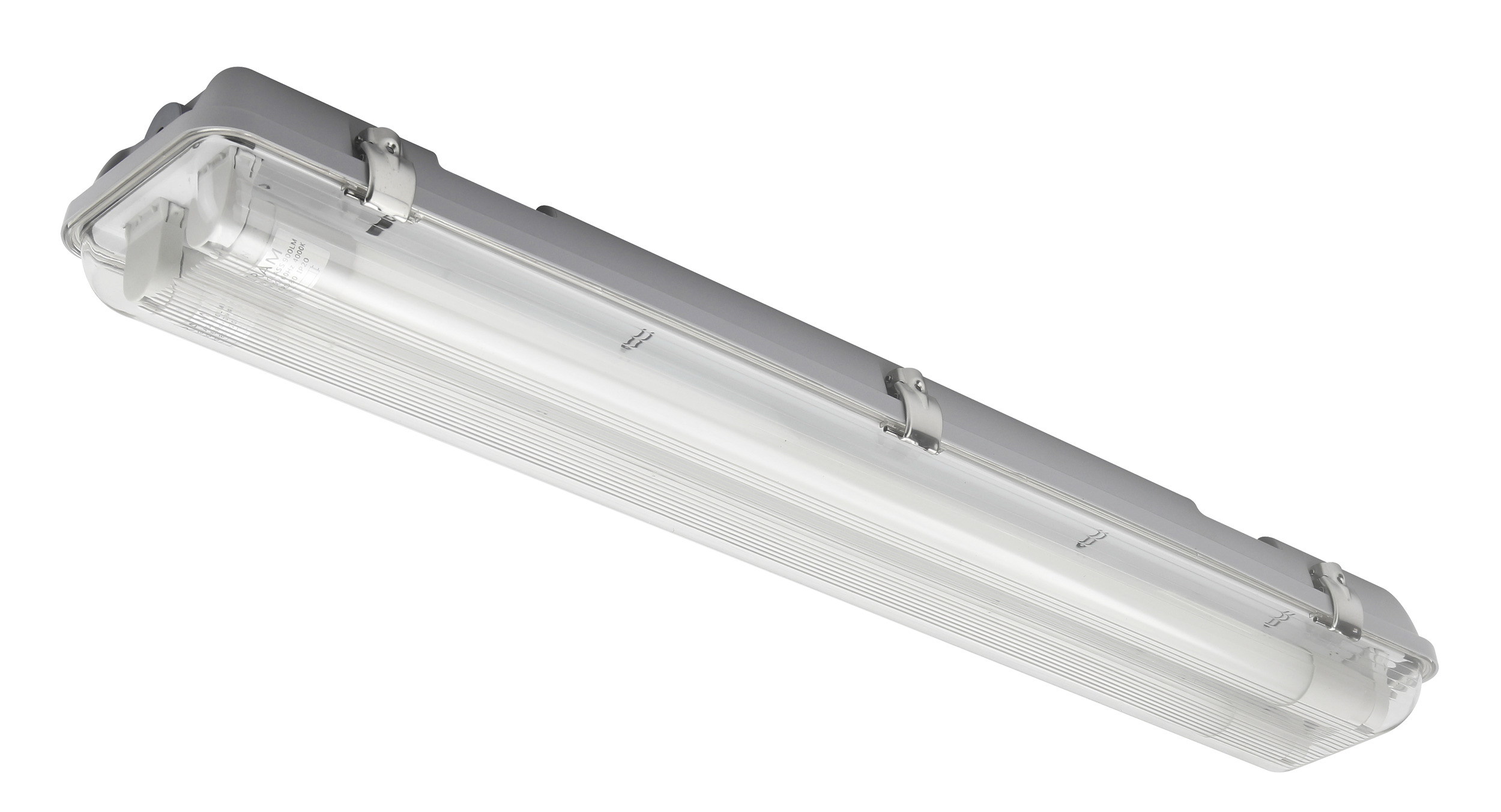 Yleisvalaisin sisäkäyttöön, IP65. Led 2 x 9W, 2 x 900lm, värilämpötila kirkas 4000K, G13-kanta. Pituus 670 mm, leveys 115 mm, korkeus 75 mm. Harmaa.