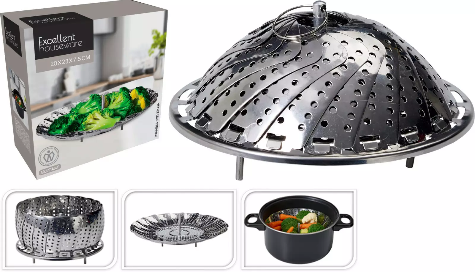 Taitettava höyrystin kattilaan – täydellinen vihanneksille, kalalle ja muille herkuille. Vie vähän tilaa ja on helppo säilyttää. Sopii useimpiin kattiloihin ja tekee terveellisestä ruoanlaitosta vaivatonta.