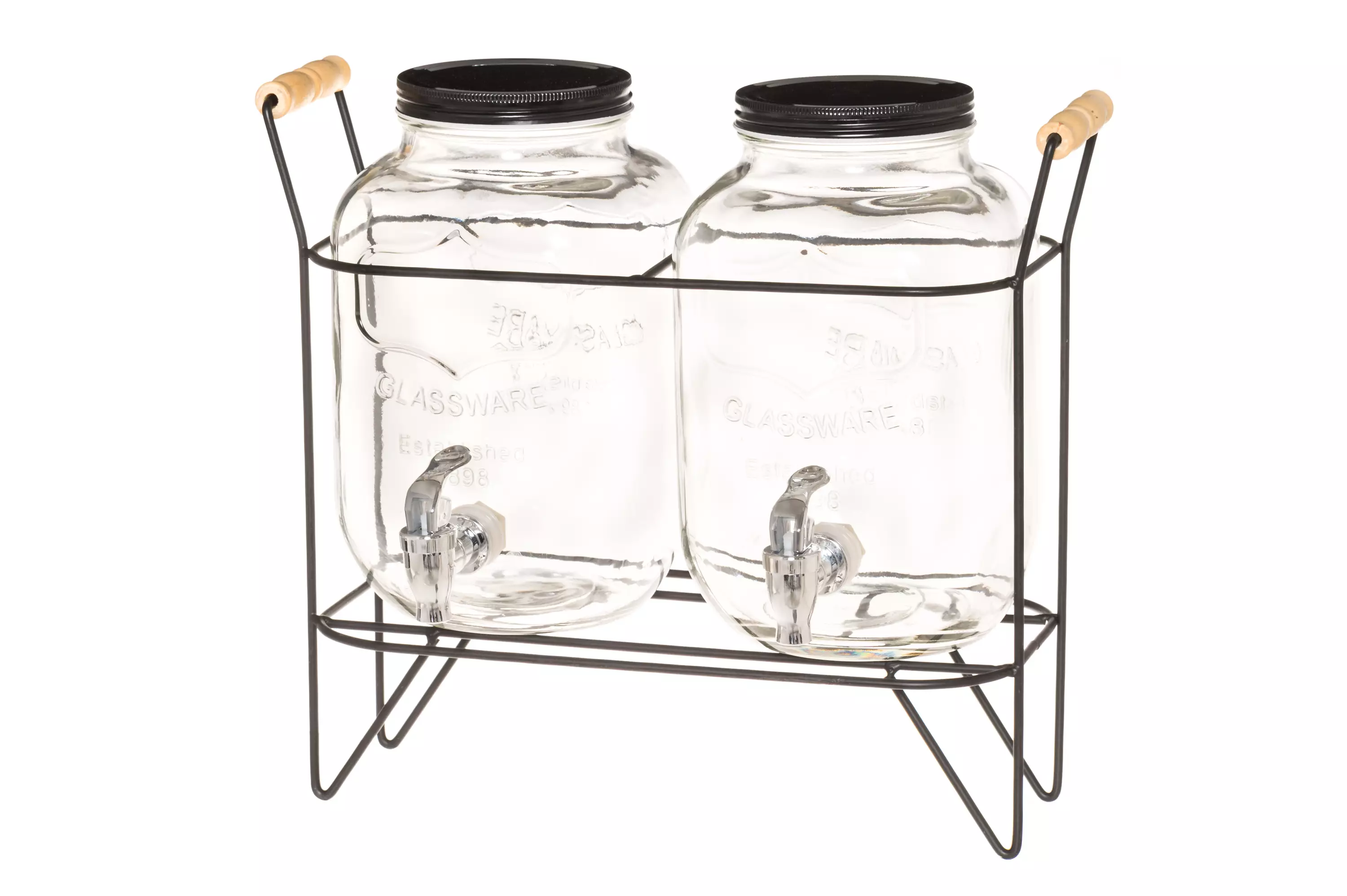 Kauniisti muotoiltu juomakanisteri kaksikko kätevässä telineessä. Ihanteellinen mihin tahansa muodolliseen tai epäviralliseen tilaisuuteen esimerkiksi illallisjuhliin, häihin, syntymäpäiville, grillijuhliin jne. Kanistereissa on leveä suuaukko, joten ne on erittäin helppo täyttää ja puhdistaa. Juomakanisterit soveltuvat täydellisesti virvoitusjuomille, jääteelle, mehuille, sangrialle, jäävedelle ja monille muille kylmille juomille. Vain käsipesu.