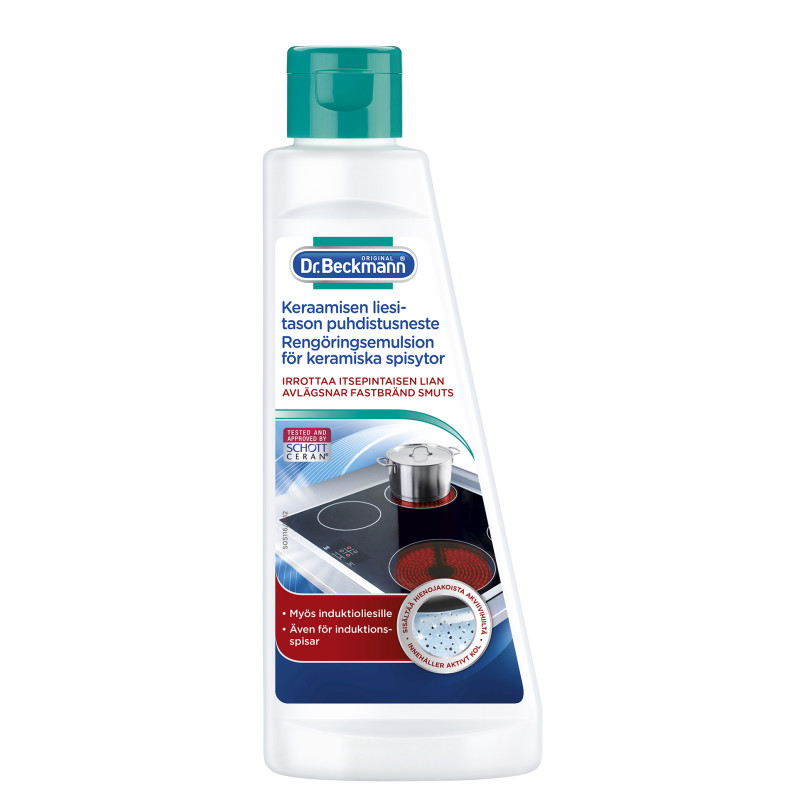 Dr. Beckmannin puhdistusneste keraamiselle ja induktioliedelle. Auttaa irrottamaan lian pintaa naarmuttamatta. Puhdistusnesteen sisältämä Jojoba-öljy antaa lopputulokselle hohtoa ja suojaa kiinni palamista vastaan. Pakkauskoko 250 ml.