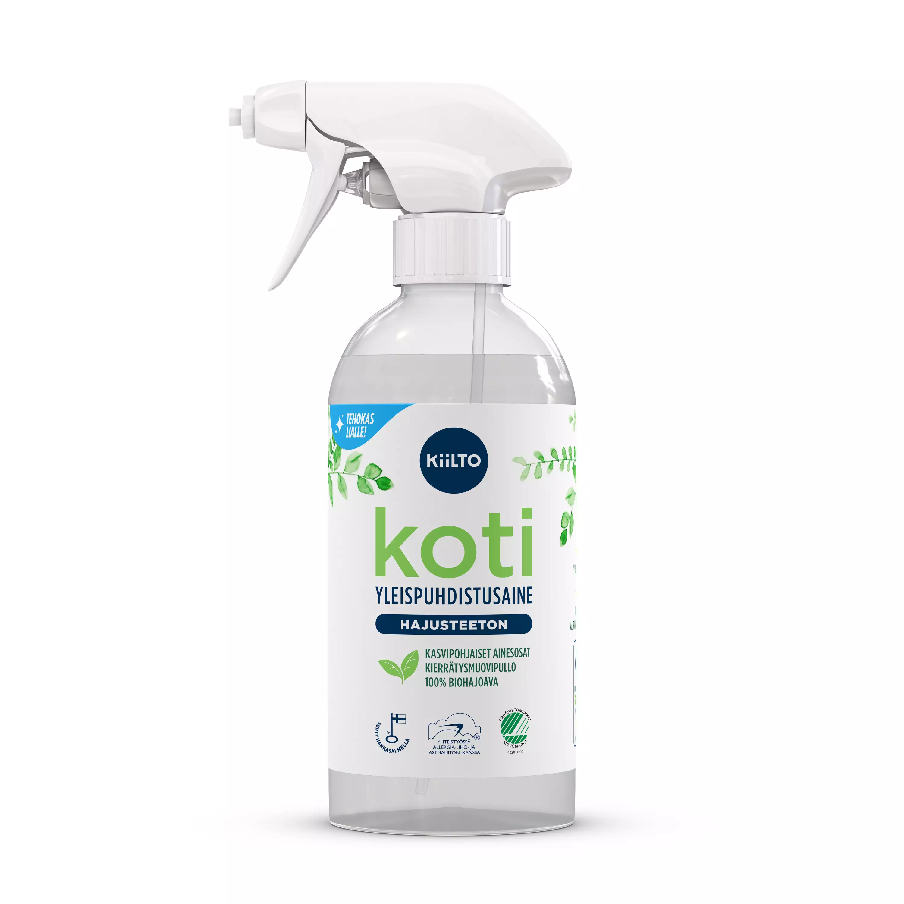 Kiilto Hajusteeton Yleispuhdistusaine puhdistaa kaikki kodin pesunkestävät pinnat tehokkaasti sekä ympäristön huomioiden. Tuotteella on Joutsenmerkki ja Allergiatunnus