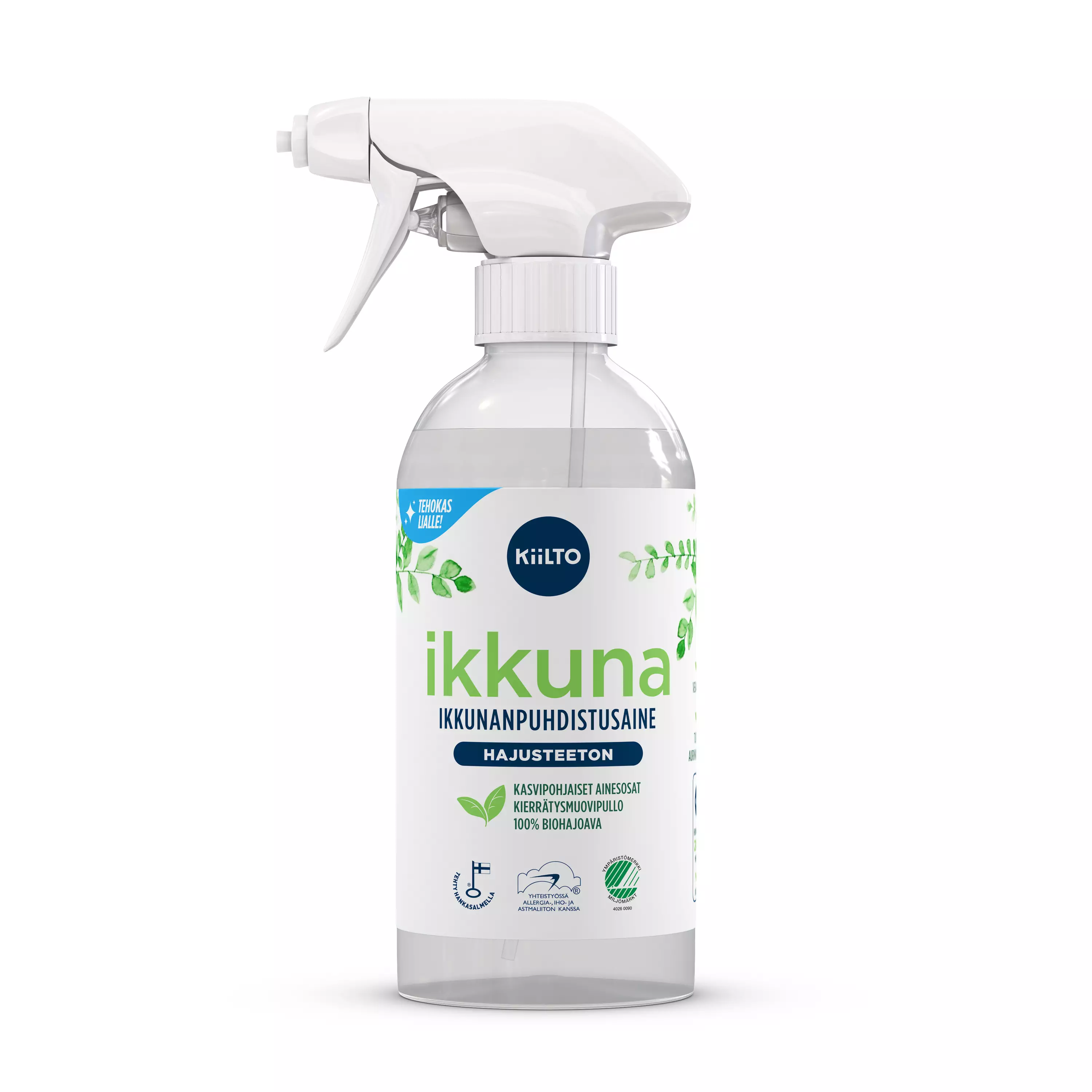 Kiilto Hajusteeton Ikkunanpuhdistaja puhdistaa erilaiset lasi-ja peilipinnat helposti, tehokkaasti sekä ympäristön huomioiden. Tuotteelle on myönnetty Joutsenmerkki ja Allergiatunnus.
