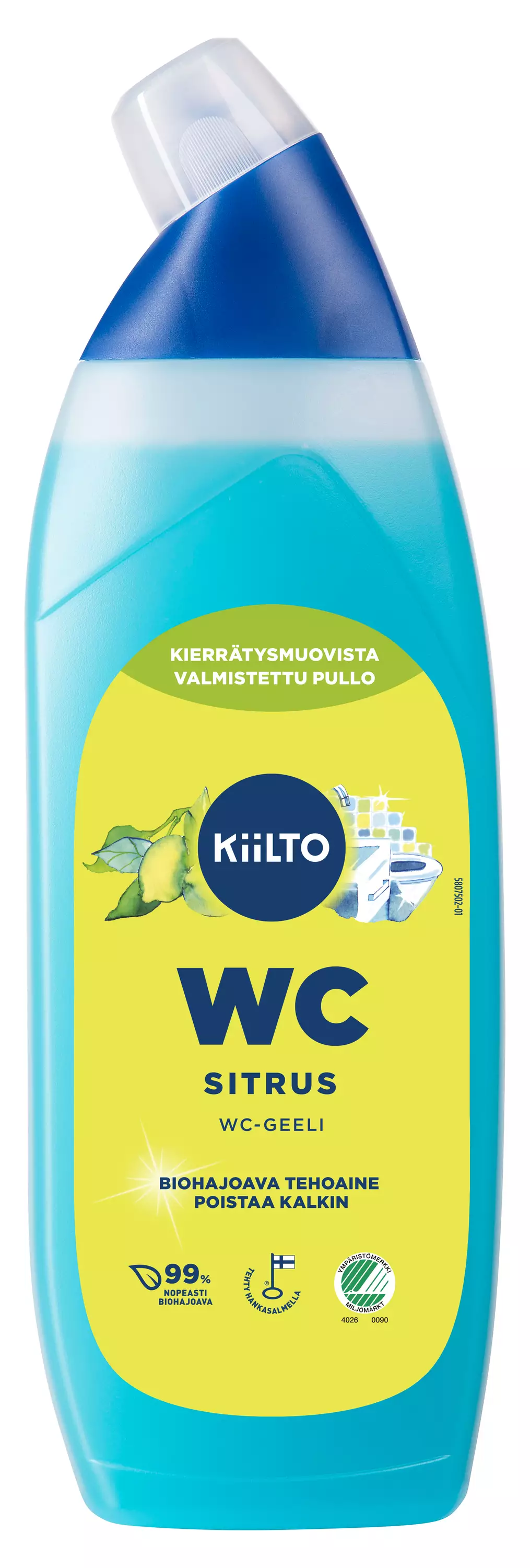 Kiilto WC-geeli Sitrus on raikkaan tuoksuinen WC-puhdistusaine. Puhdistaa ja raikastaa WC-istuimen altaan turvallisesti, tehokkaasti sekä ympäristön huomioiden. Poistaa kalkkisaostumia. Sisältää luonnollista maitohappoa. Tuotteella on Joutsenmerkki.